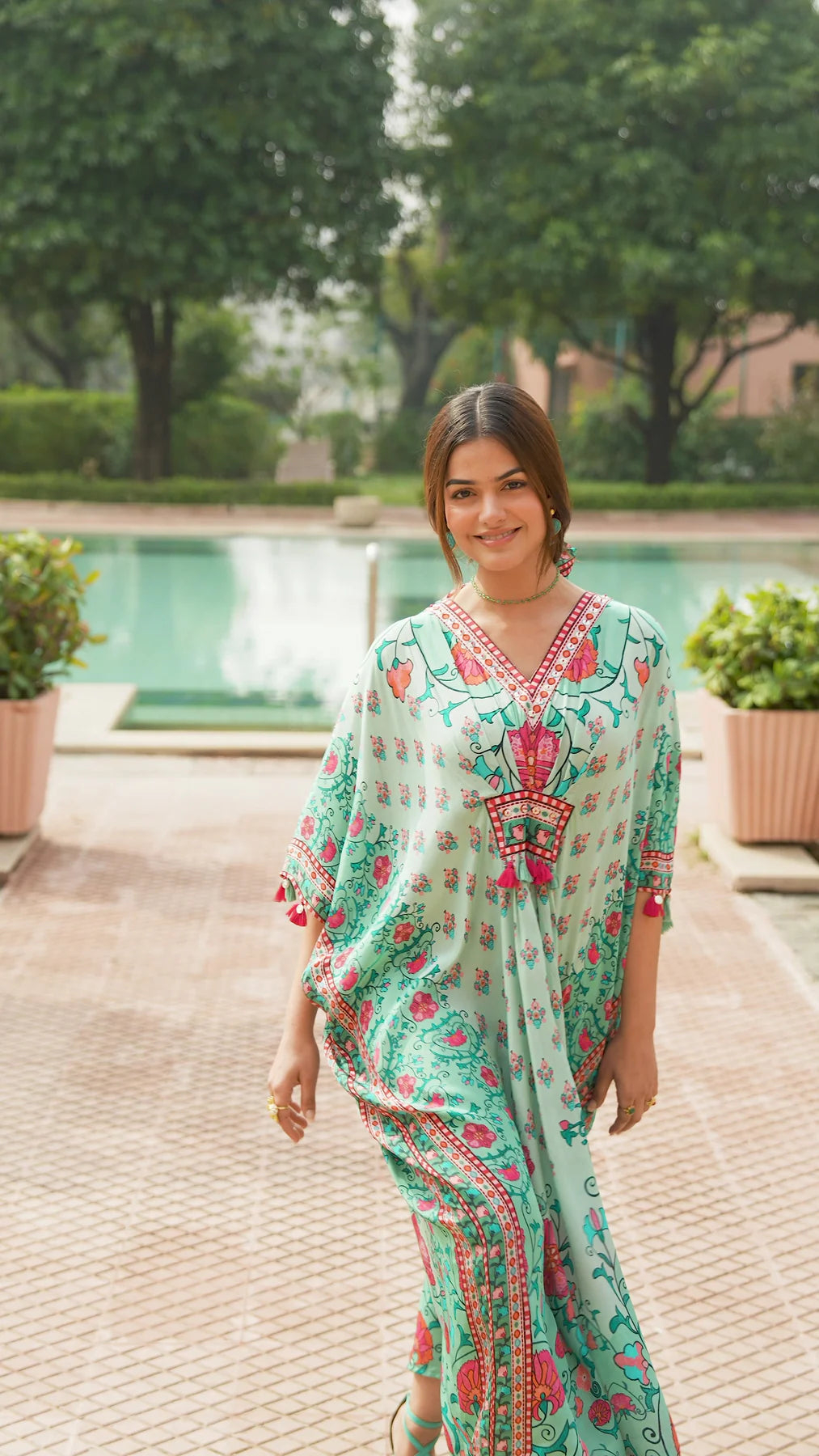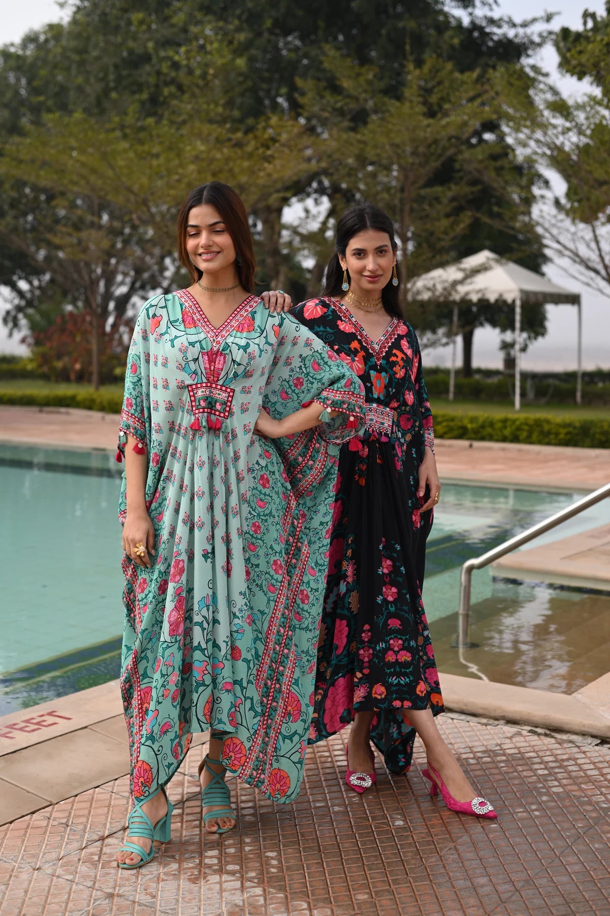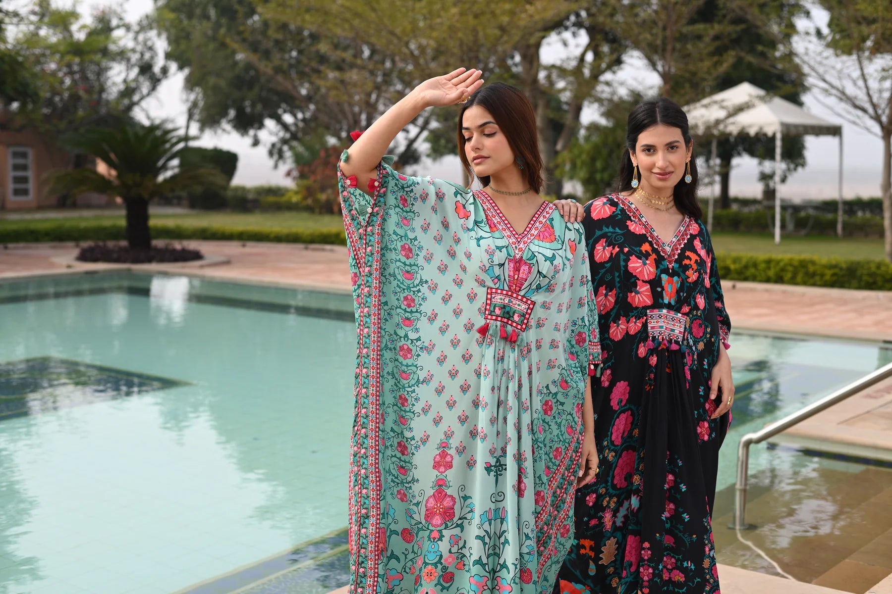 Make an unforgettable statement with the Midnight Sable Black Panel Kaftan, a blend of fluid elegance and contemporary edge. Crafted from luxurious crepe fabric, this kaftan drapes beautifully with its soft flow and subtle sheen. The side placement panel adds a modern twist to its classic silhouette, creating a refined yet striking look that transitions effortlessly from day to evening wear.