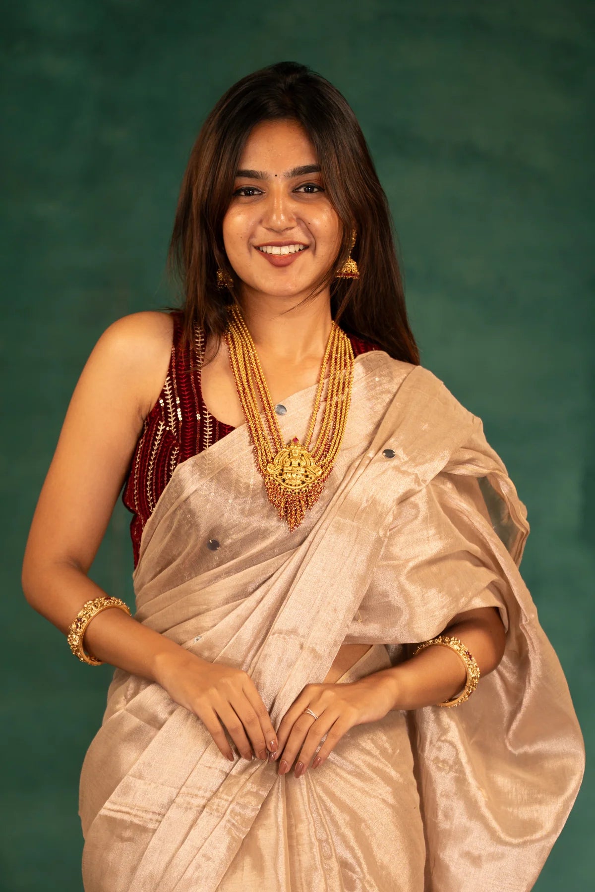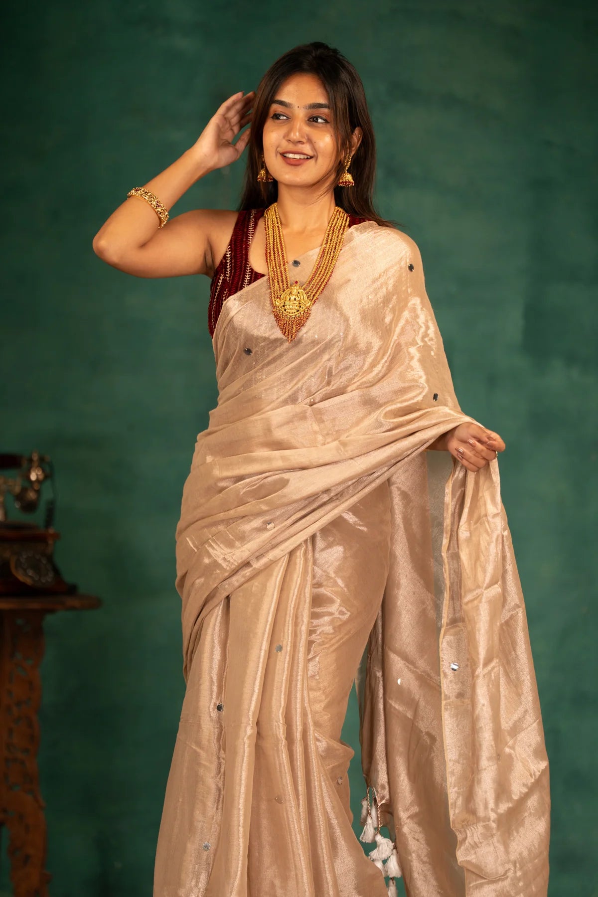 The Moonlit Beige Tissue Mul Cotton Saree combines airy comfort with understated glamour. Crafted from soft tissue mul cotton, it flows effortlessly and feels lightweight, allowing long hours of wear without heaviness. Its translucent sheen creates a delicate play of light, while scattered sequins add gentle sparkle reminiscent of moonlight. Playful tassels at the pallu provide a youthful and vibrant touch, making this saree perfect for festive occasions, poojas, and daytime celebrations.