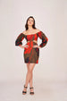 This dress features a vibrant mix of red, green, and black in a bold floral abstract print. The side cut-outs give a fresh twist, revealing just the right amount of skin without compromising comfort. A concealed zip at the back ensures a clean, secure fit.