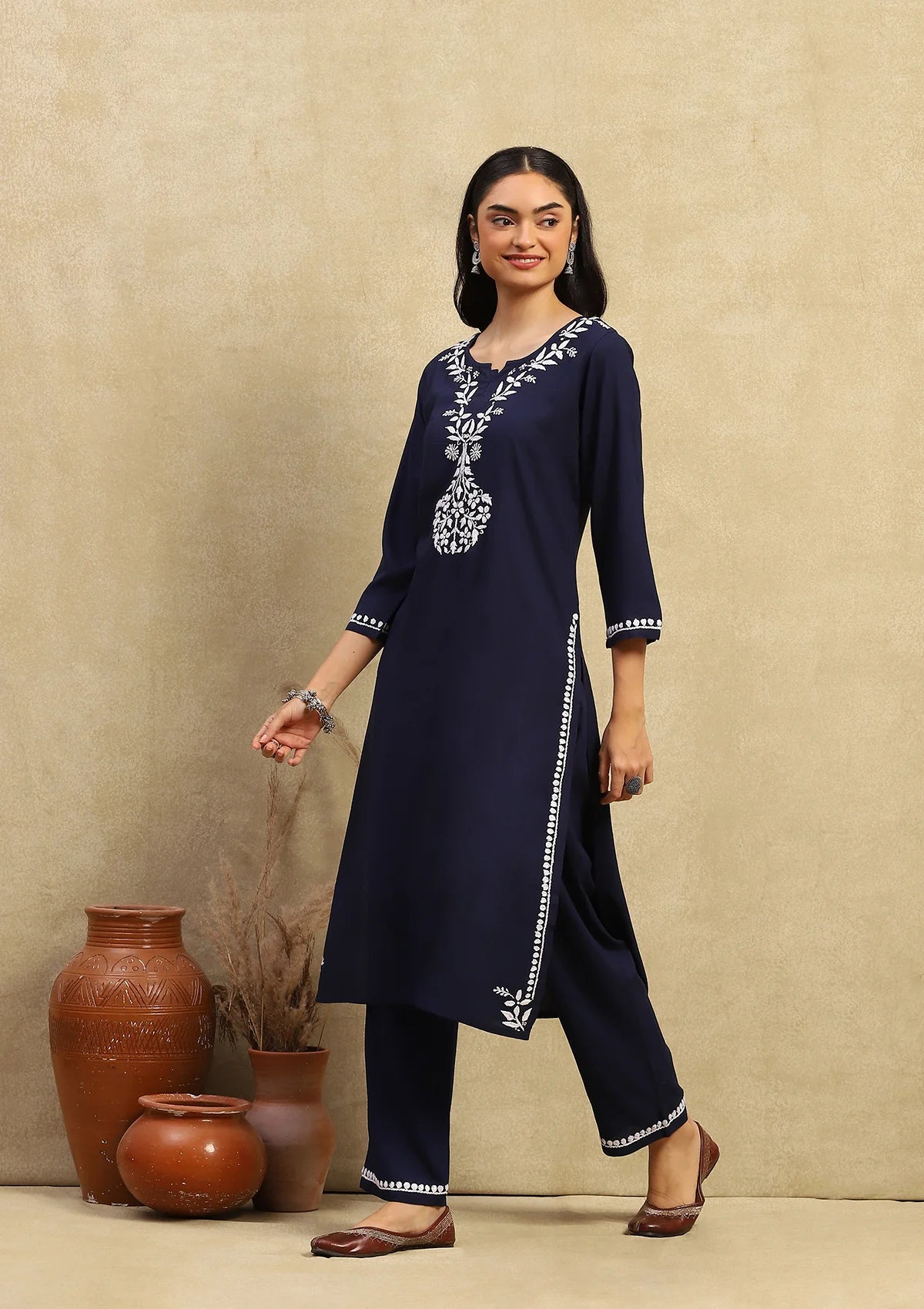 Grace your everyday wardrobe with this beautifully detailed Rayon Chikankari Straight Kurta Set. Crafted from premium rayon, it offers a soft, breathable texture that keeps you comfortable all day long. The straight silhouette ensures a flattering fit, while the hand-embroidered chikankari work adds a touch of timeless artistry. Designed with a classic round neckline and full sleeves, this set is perfect for workwear, daily wear, or casual outings where elegance meets ease. Paired with matching bottoms, it delivers effortless sophistication in every detail.