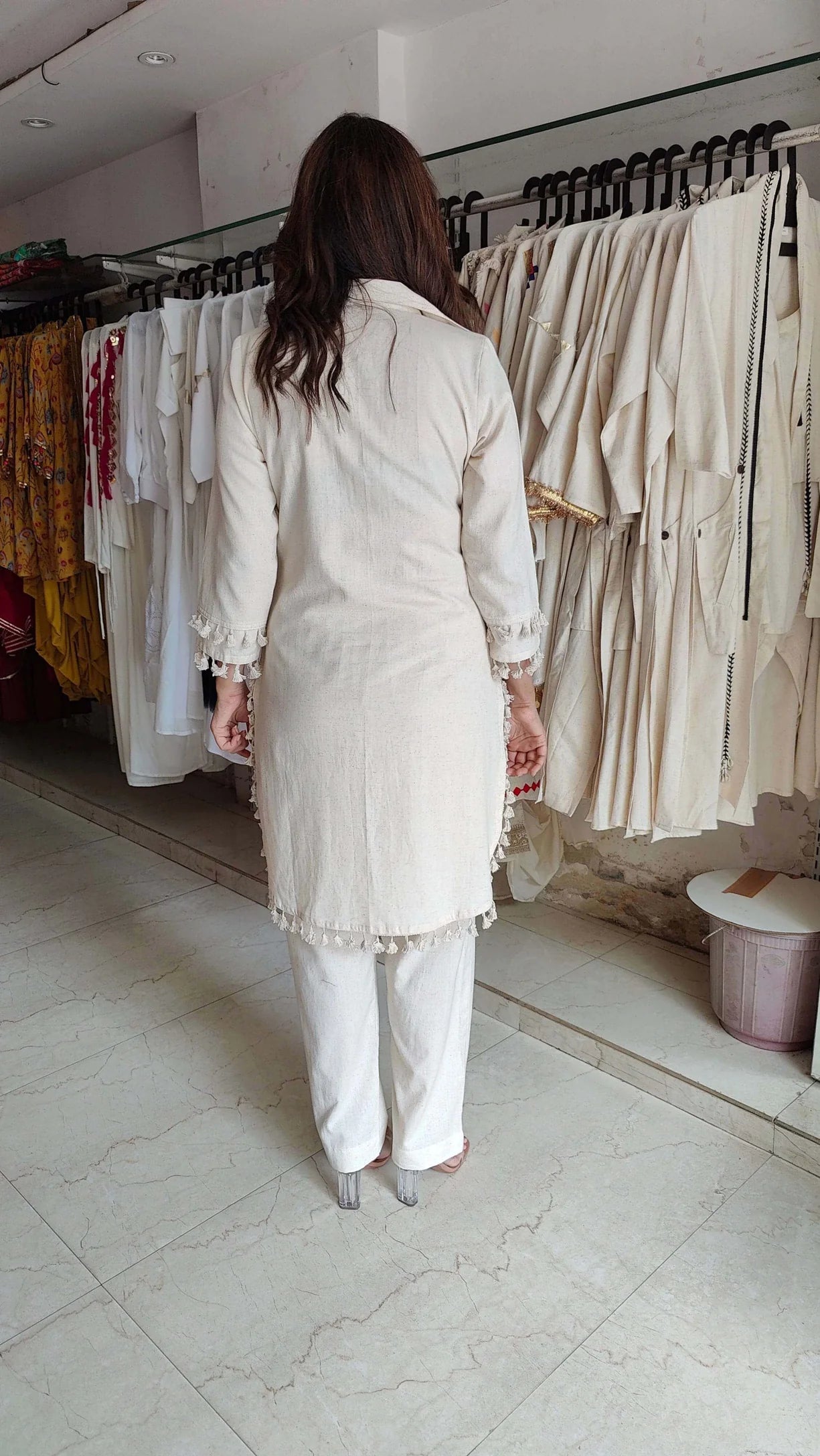 Effortlessly chic and gracefully detailed, the Off White Blue Floral Embroidered Co-ord Set brings timeless sophistication to your wardrobe. Crafted from premium modal cotton, this two-piece ensemble features intricate floral embroidery enhanced with delicate tassel details. The elasticated pants ensure comfort without compromising style, making this outfit perfect for brunches, festive gatherings, and elegant day events. Designed to exude freshness and femininity, it’s your go-to for refined, easy elegance.