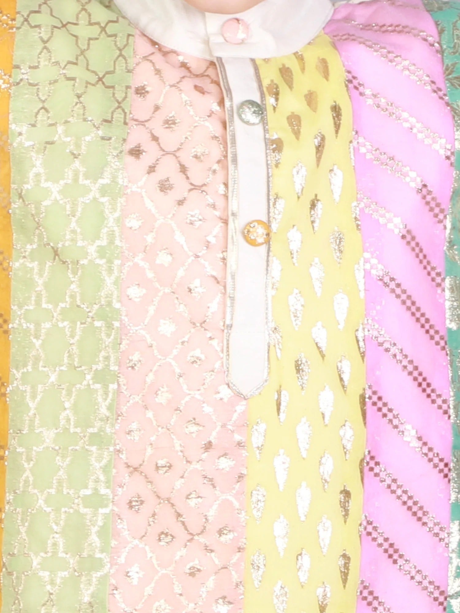 Embrace classic elegance with the Off White Cotton Silk Ethnic Kurta Set, a perfect blend of comfort and festive charm. Crafted from soft cotton silk, the kurta features colorful zari panels, a front placket opening, and a flattering silhouette that pairs beautifully with the elasticated pajama. Lightweight and breathable, this set is ideal for family gatherings, festive occasions, and traditional celebrations.