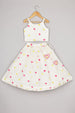 The chanderi top feels soft and airy, offering breathability throughout the day. It features fuschia pink and yellow heart embroidery on the front, bringing a cheerful pop of color to the outfit. The hooks at the back allow easy wearing and a secure fit, while the sleeveless cut makes it great for warmer days.