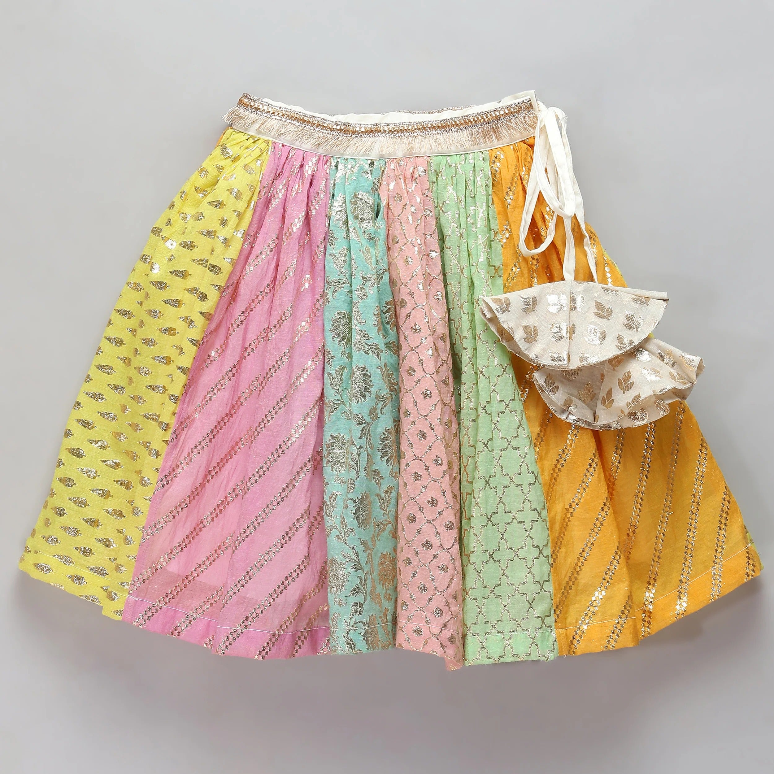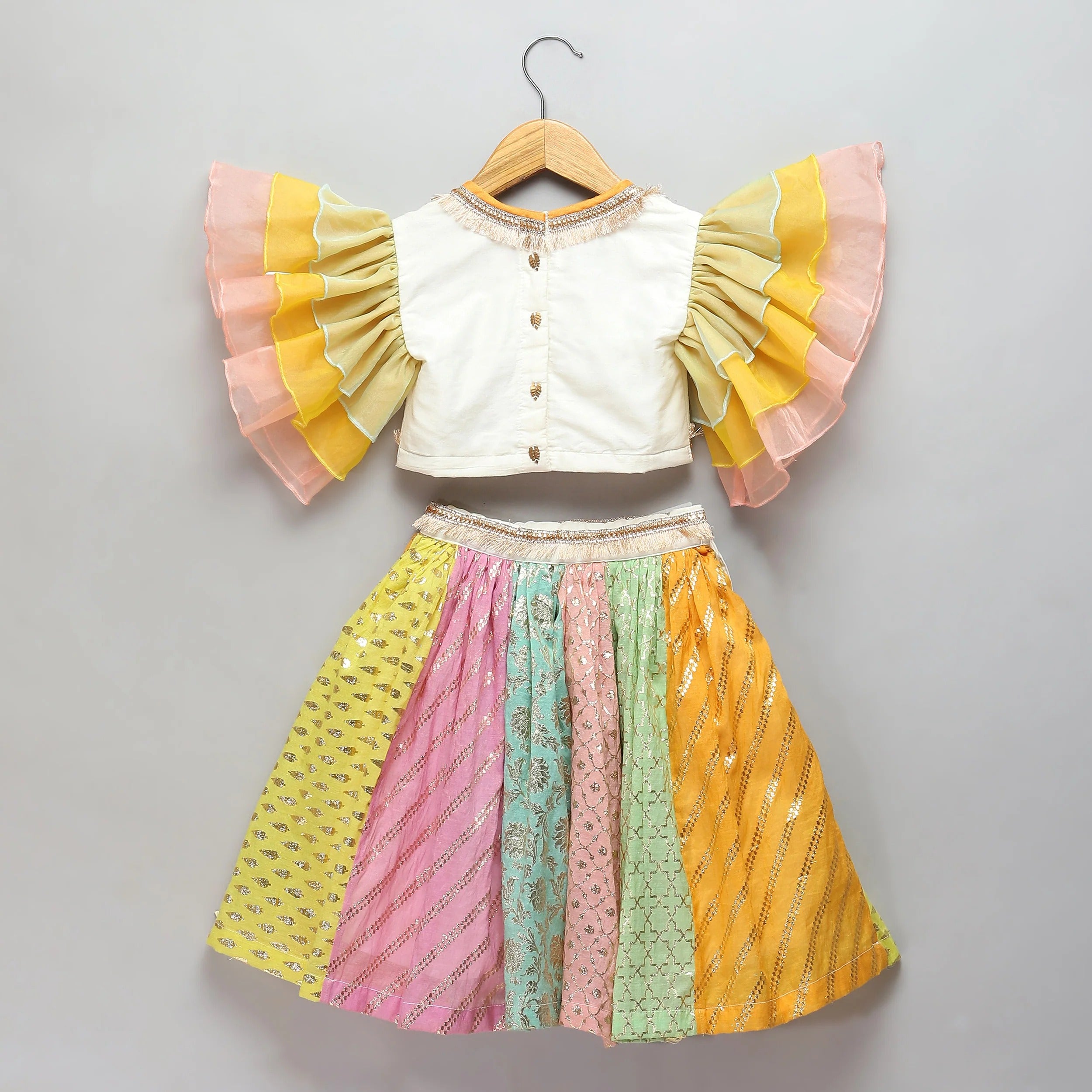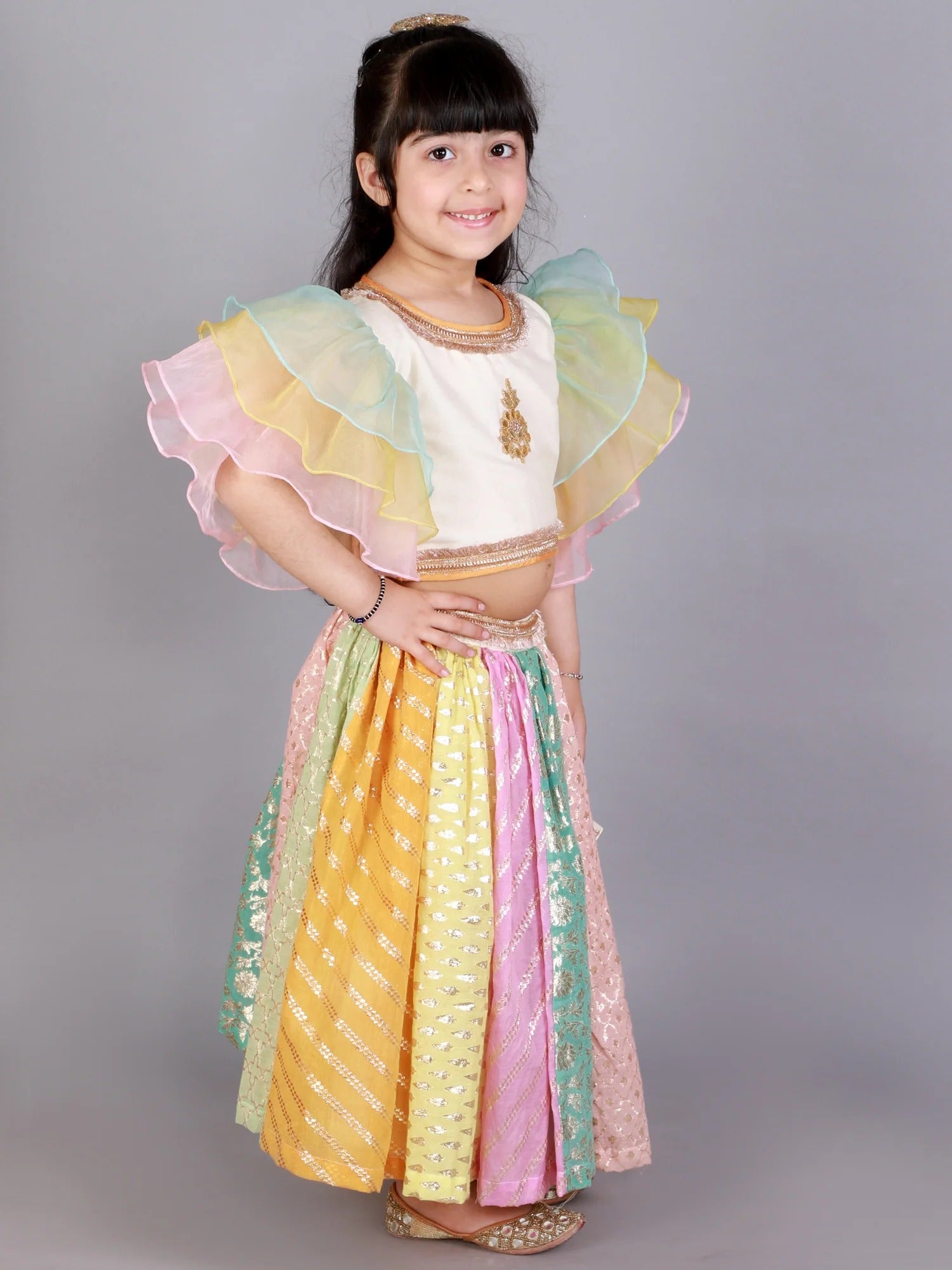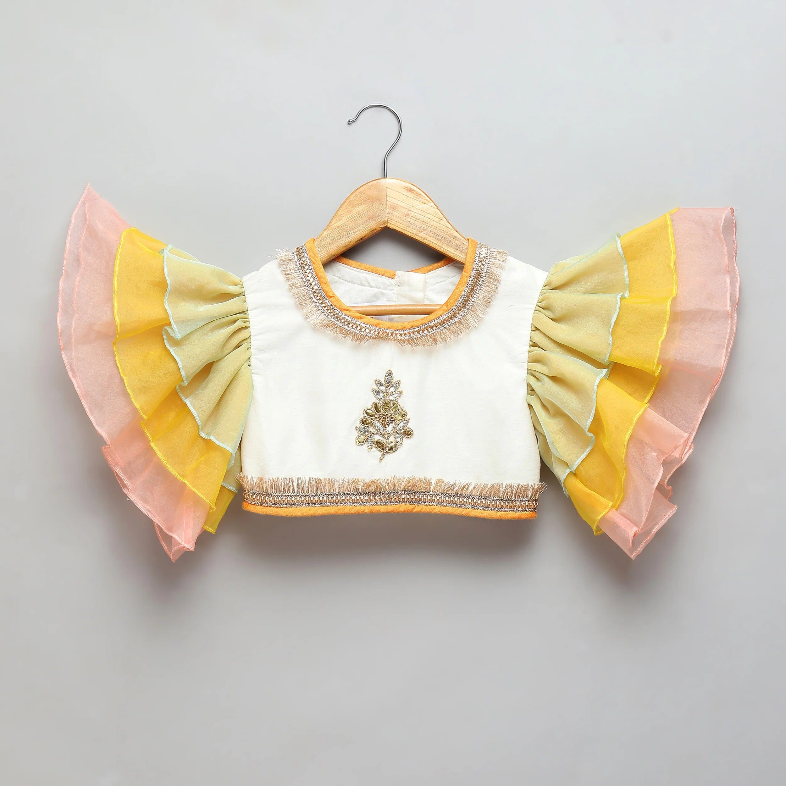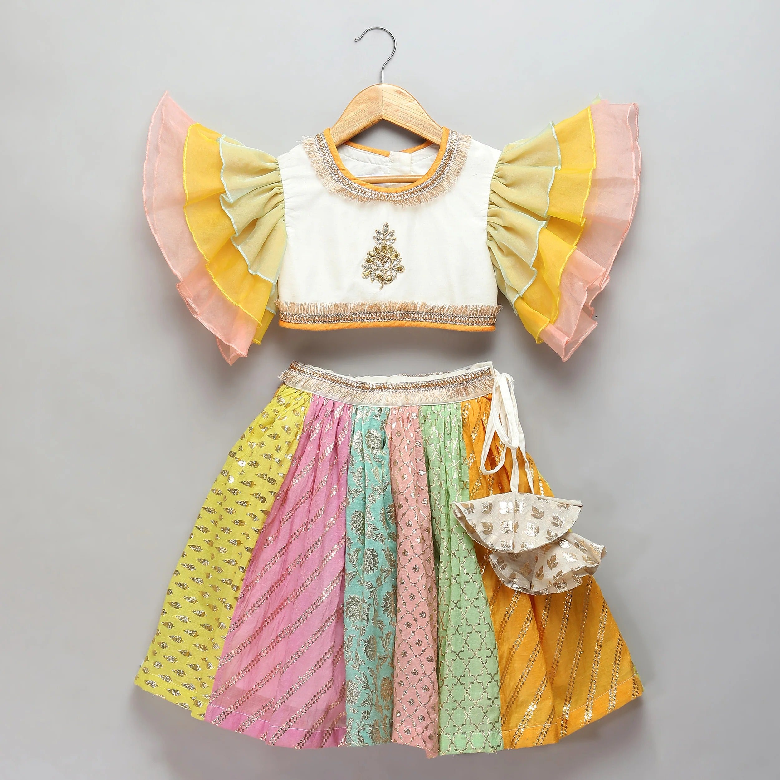 Step into festive elegance with the Off White Multi-Color Organza Lehenga Set, designed to combine traditional charm with modern style. The cotton silk blouse features exquisite placement embroidery, lace embellishments, frill sleeves, and a back opening for a comfortable fit, with soft cotton lining for added comfort. The lehenga is crafted from multi-colored, paneled cotton zari and detailed with embroidered lace at the waist, adjustable drawstrings, and beautiful tassels for a perfect fit. Lightweight, vibrant, and intricately designed, this set is ideal for weddings, receptions, and festive celebrations.