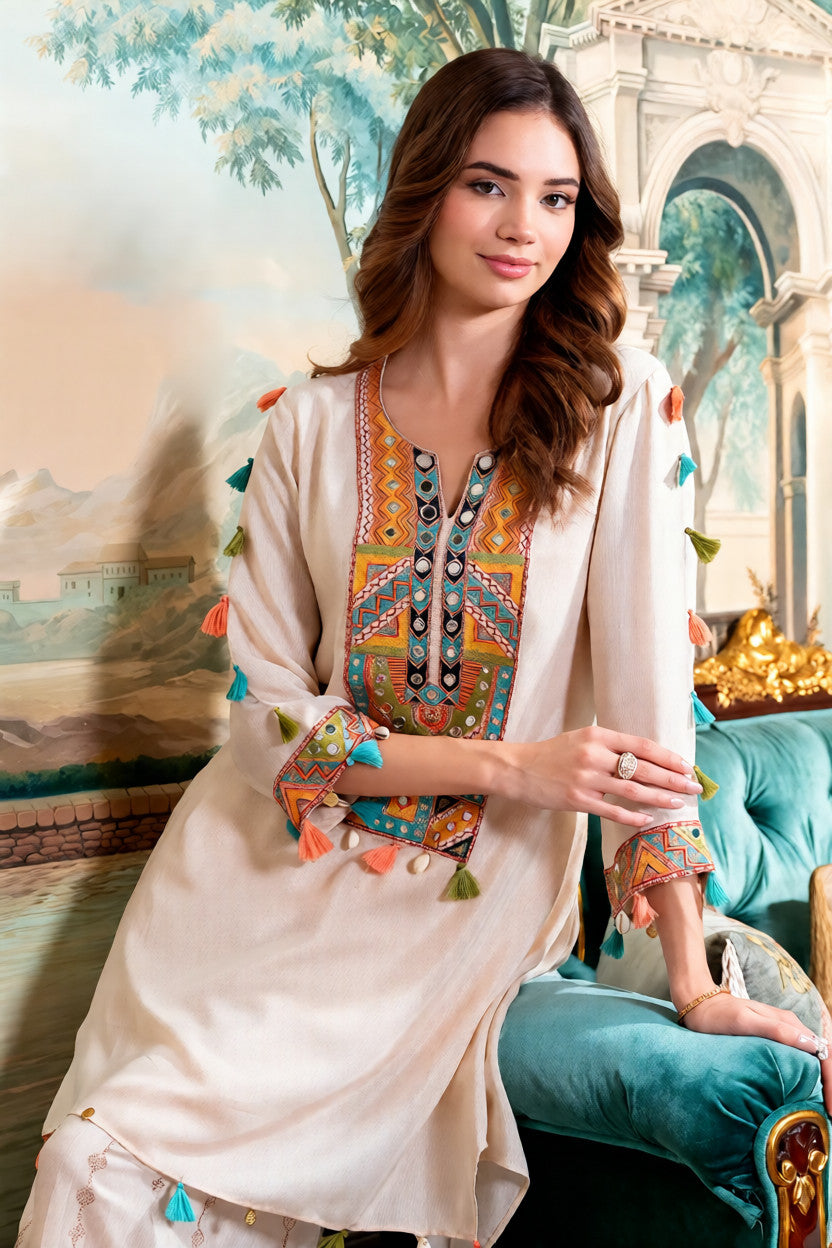 Add this Off-White Muslin Embroidered Co-Ord Set to your wardrobe for a stylish, comfortable, and versatile ethnic ensemble.