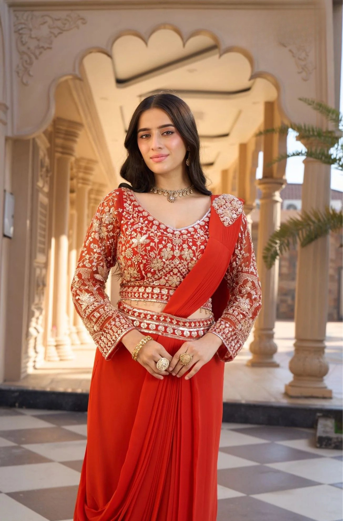 Add this Orange Beads Work Viscose Pre-Draped Saree to your wardrobe for a refined festive look that blends comfort, elegance, and effortless style.