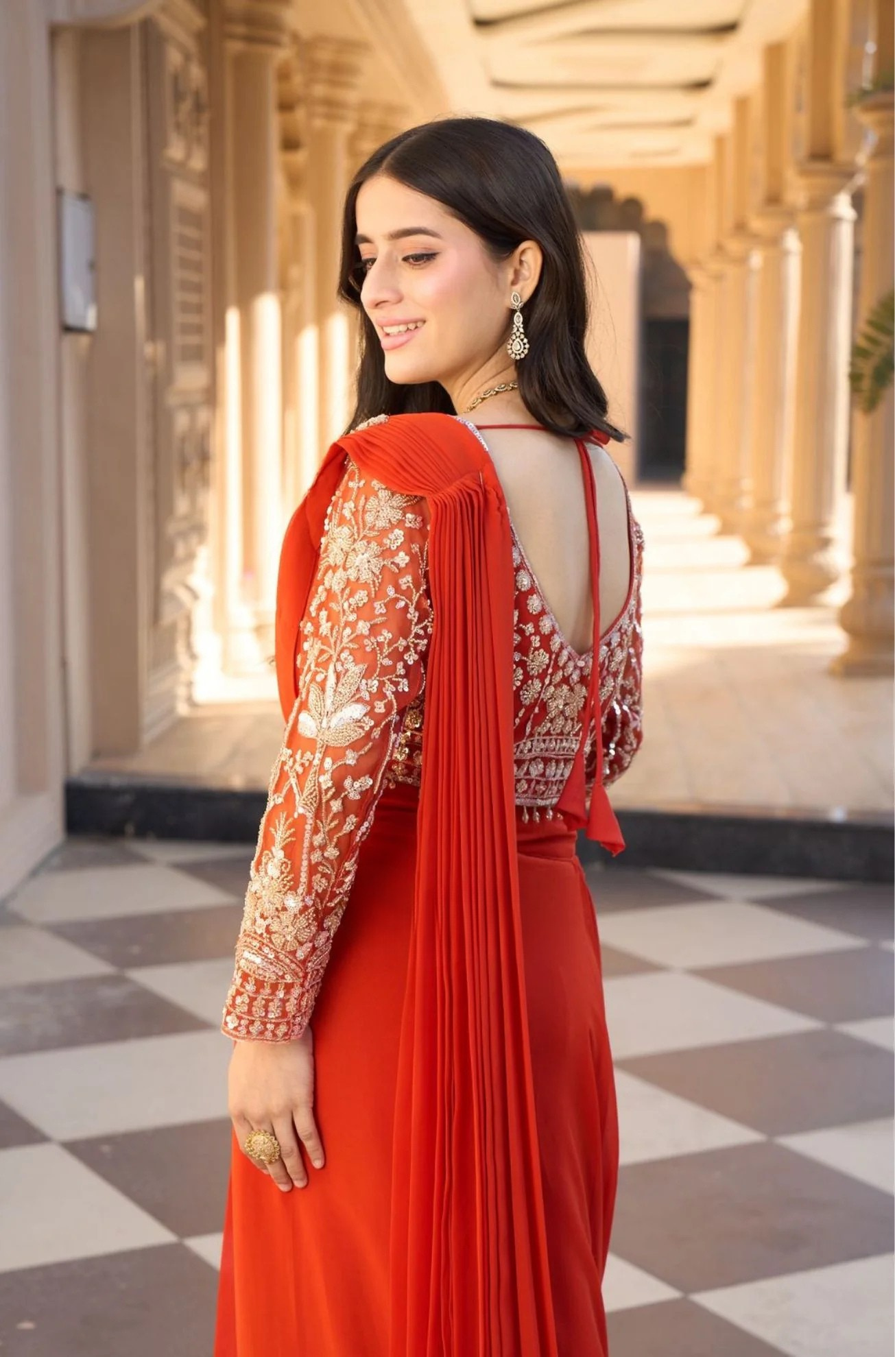 This Orange Beads Work Viscose Pre-Draped Saree is designed to bring effortless elegance to festive occasions. Crafted from smooth, flowy viscose, it drapes beautifully while offering lightweight comfort. The vibrant orange hue is enhanced with delicate beadwork that adds a refined festive sparkle without overpowering the look. Perfect for family functions and light wedding events, this pre-draped saree delivers a graceful silhouette with easy wearability.