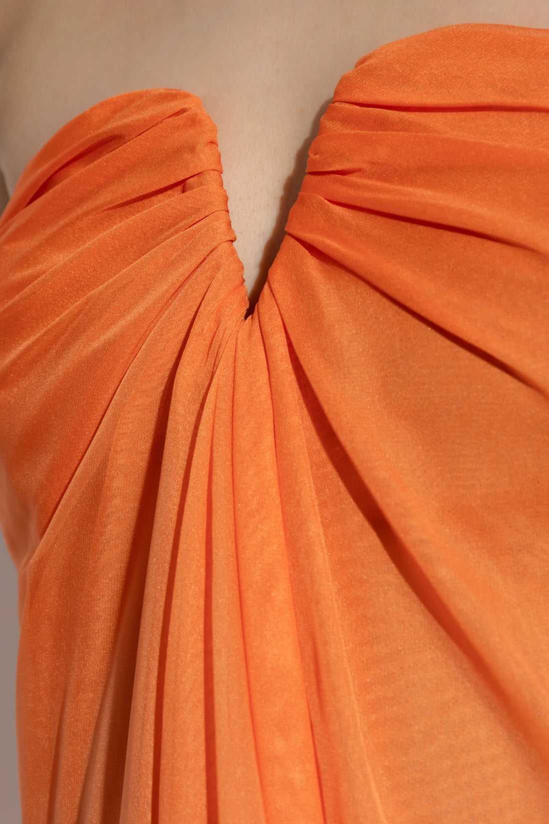 The Orange Ombre Semi-Sheer Gown combines bold elegance with contemporary flair. Crafted from semi-sheer ombre fabric, it features a chic triangle cutout at the bust and a flowing ankle-length hem. The form-fitting silhouette with a center back zipper creates a flattering, figure-enhancing shape, while the vibrant orange hue ensures a striking presence at parties, evening events, or special occasions.