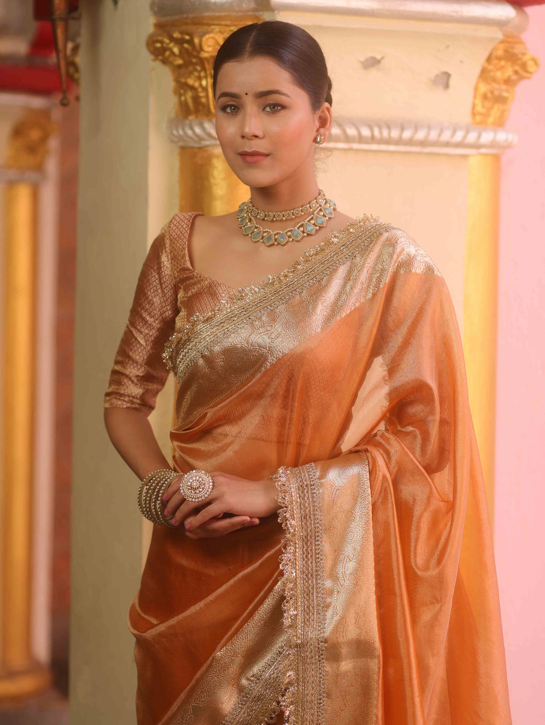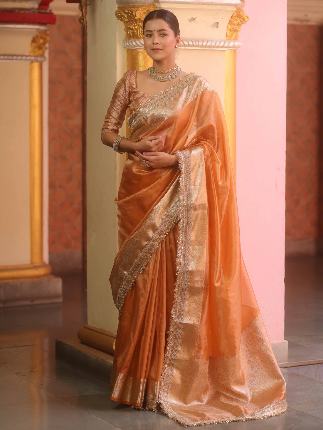 Why You’ll Love It – Peach Tissue Zari Saree