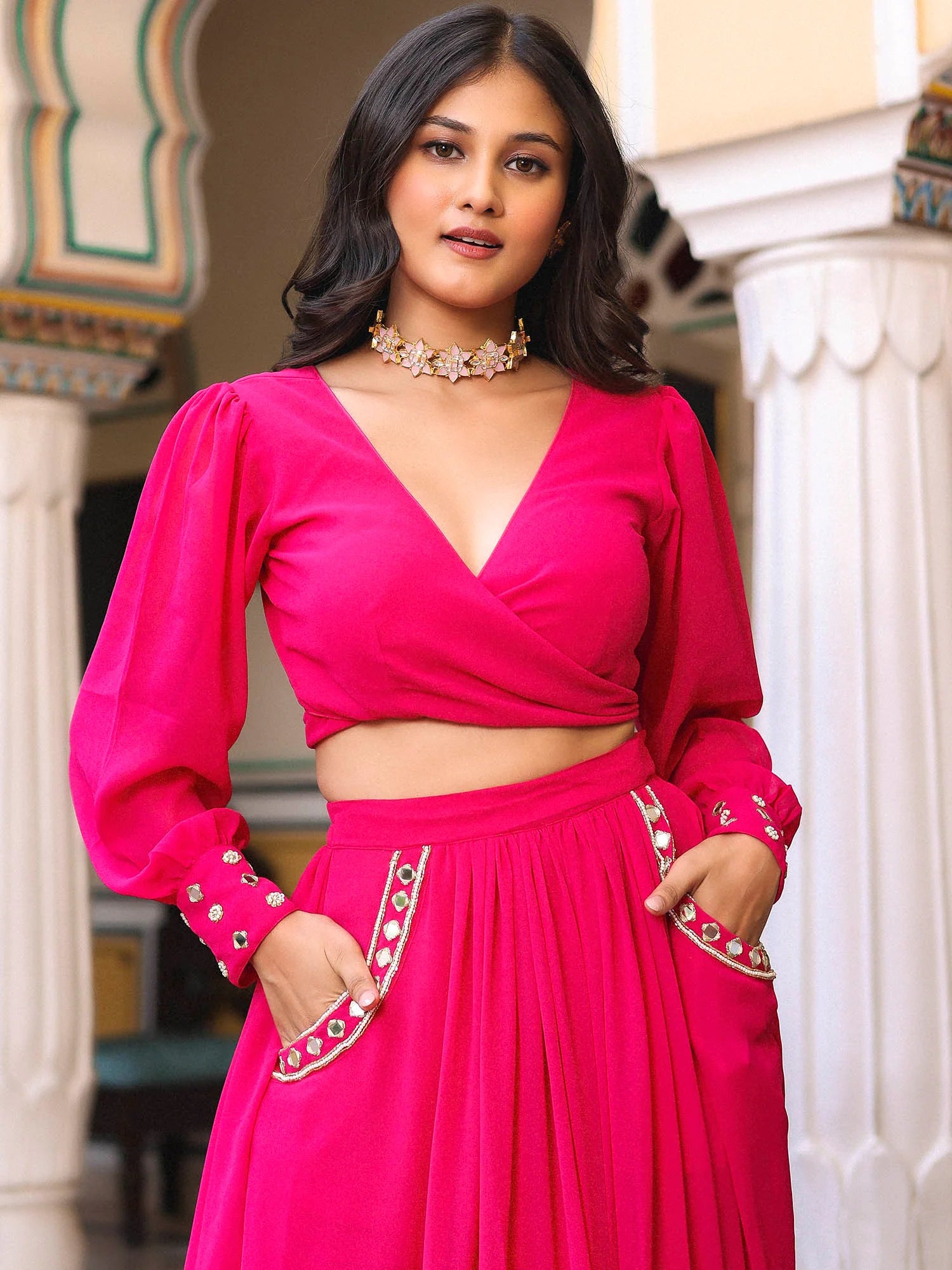 A perfect choice for weddings, festive gatherings, and celebrations, this Pink Georgette Handwork Lehenga Set blends elegance with traditional artistry.