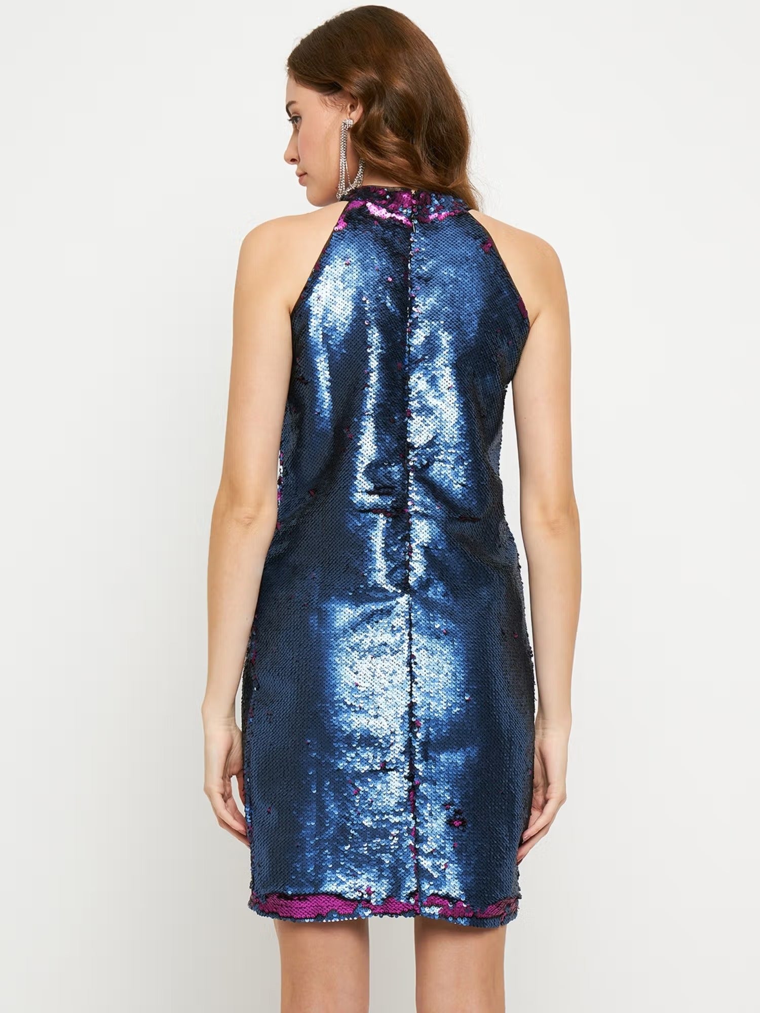 Shine bright at every celebration with our Polyester Cobalt Blue Sequin Halter Dress. Designed to dazzle, this bodycon silhouette embraces your curves with sophistication while the shimmering sequin embellishments exude a bold, festive charm. The halter neckline adds a touch of allure, making it the ultimate statement piece for parties and night-outs.