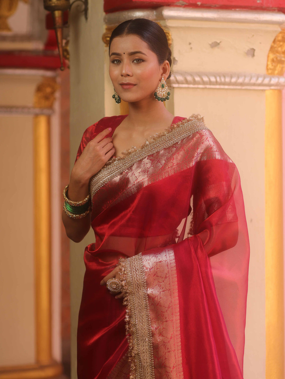 Glow in the festive spirit with the Red Tissue Saree with Zari Lace Border, crafted from lightweight tissue fabric for a smooth and elegant drape. The striking zari lace border adds a touch of shimmer and sophistication, making it perfect for weddings, parties, and special occasions. Comes with a matching blouse piece for a complete traditional look.