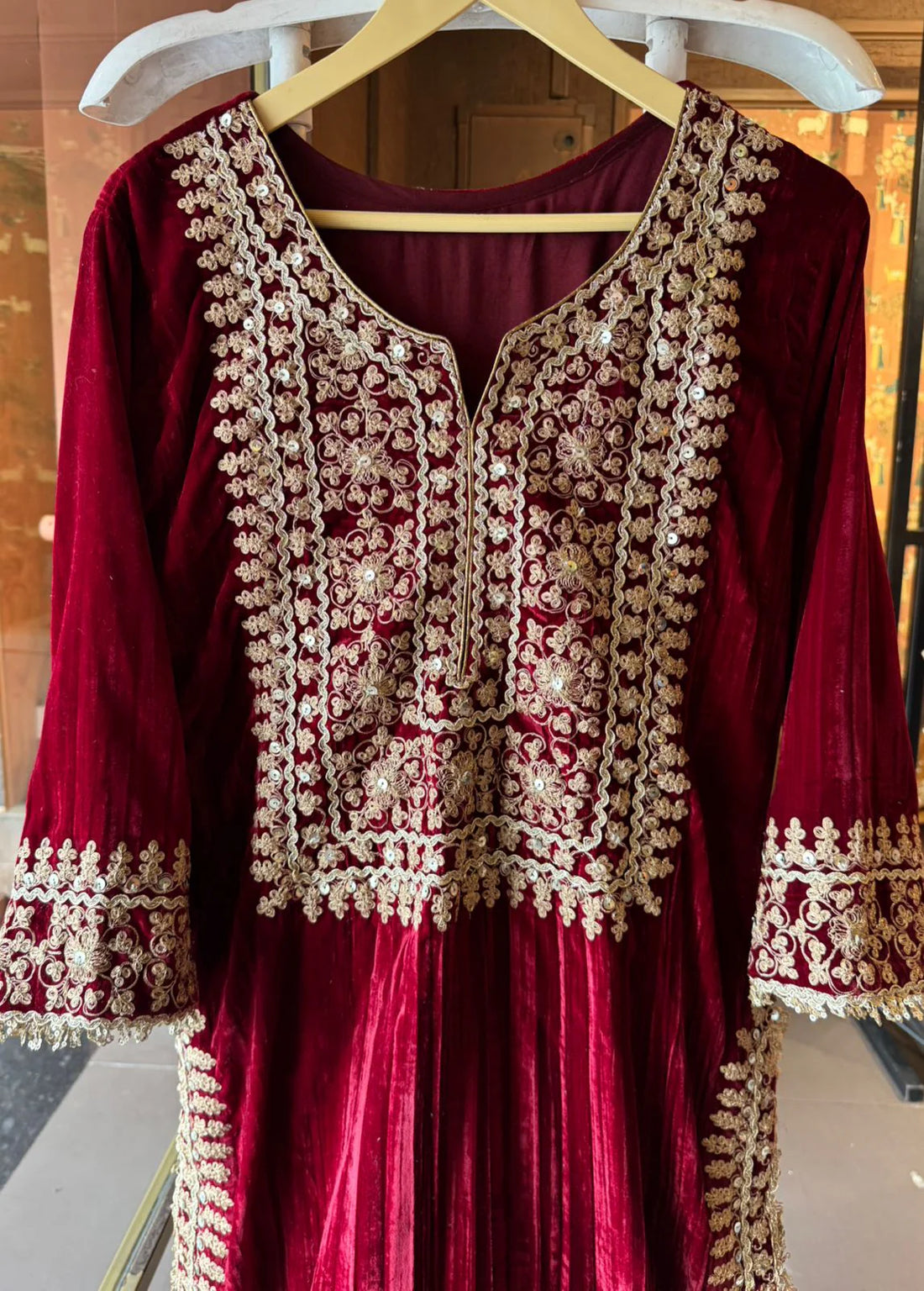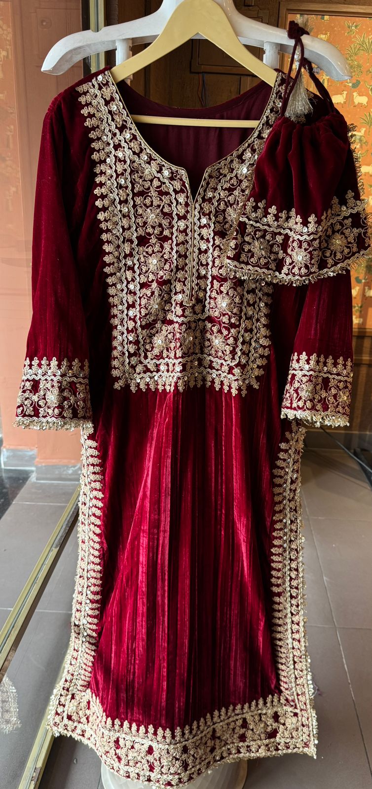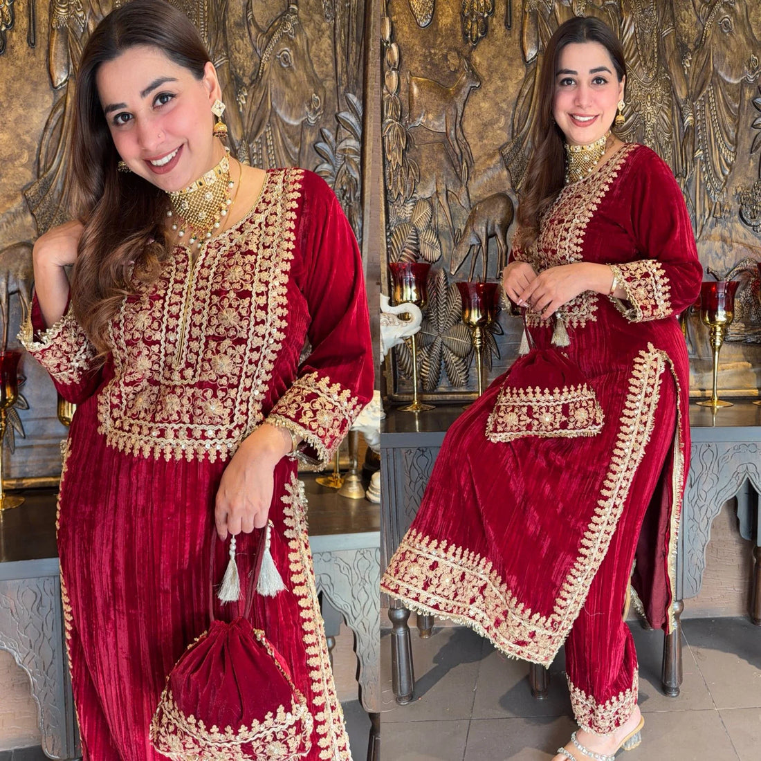 This Red Velvet Heavy Embroidered Kurta exudes sophistication and traditional charm. Crafted from rich velvet, it offers a plush texture and a flattering drape. The intricate, heavy embroidery enhances the luxurious appeal, making it perfect for weddings, festive gatherings, and grand celebrations. Designed as a stitched set, this kurta provides a polished and elegant silhouette that combines comfort with statement style.