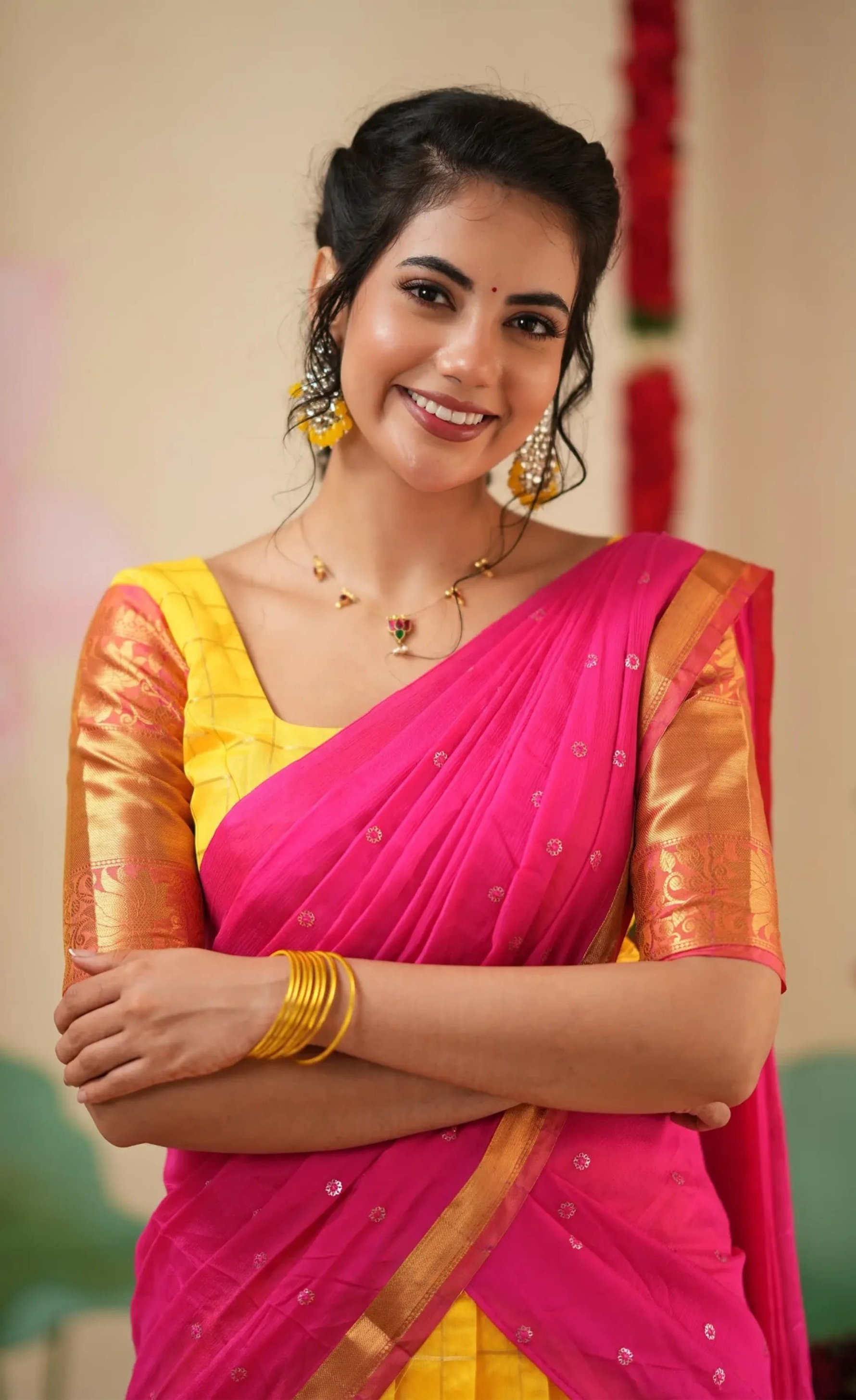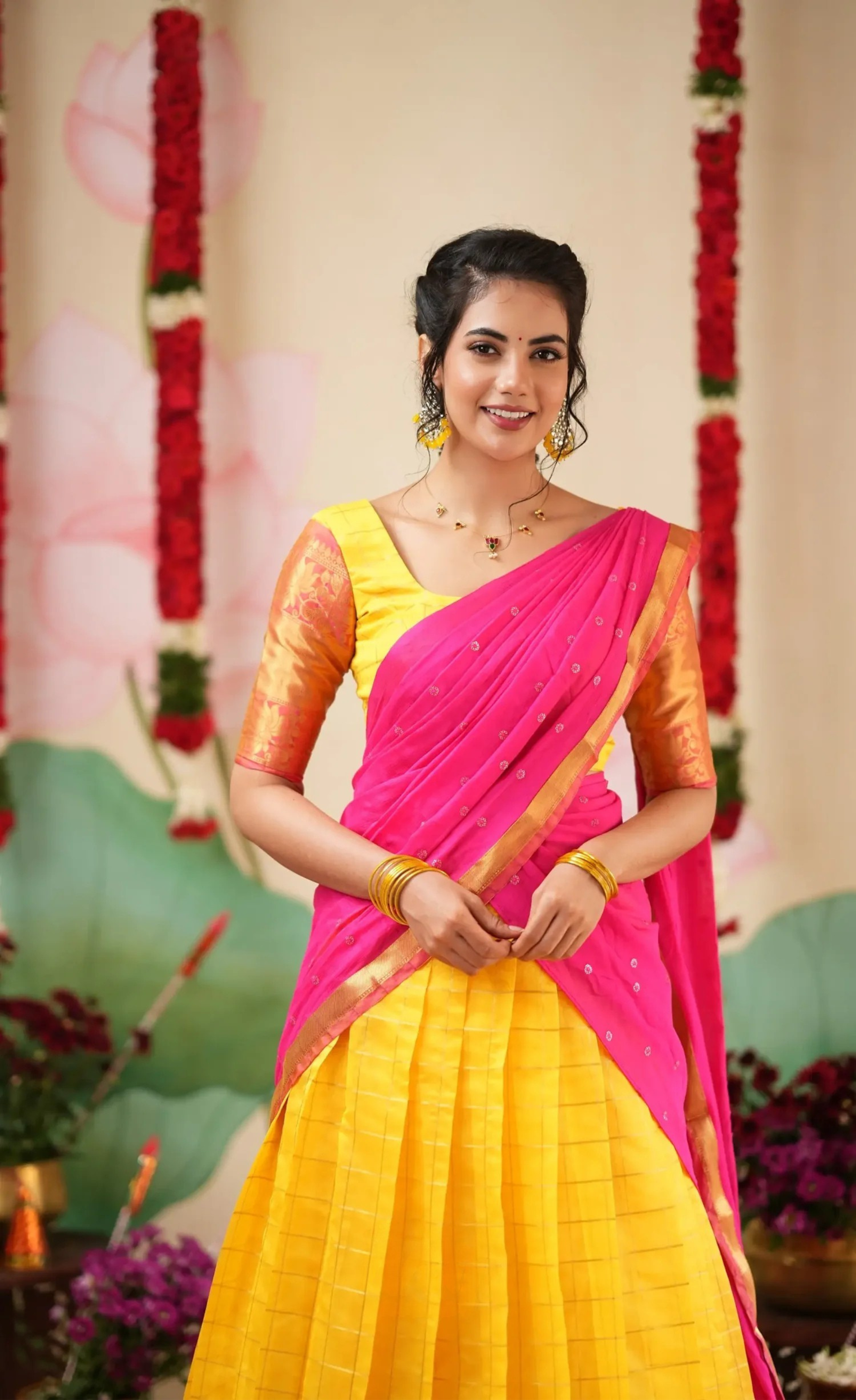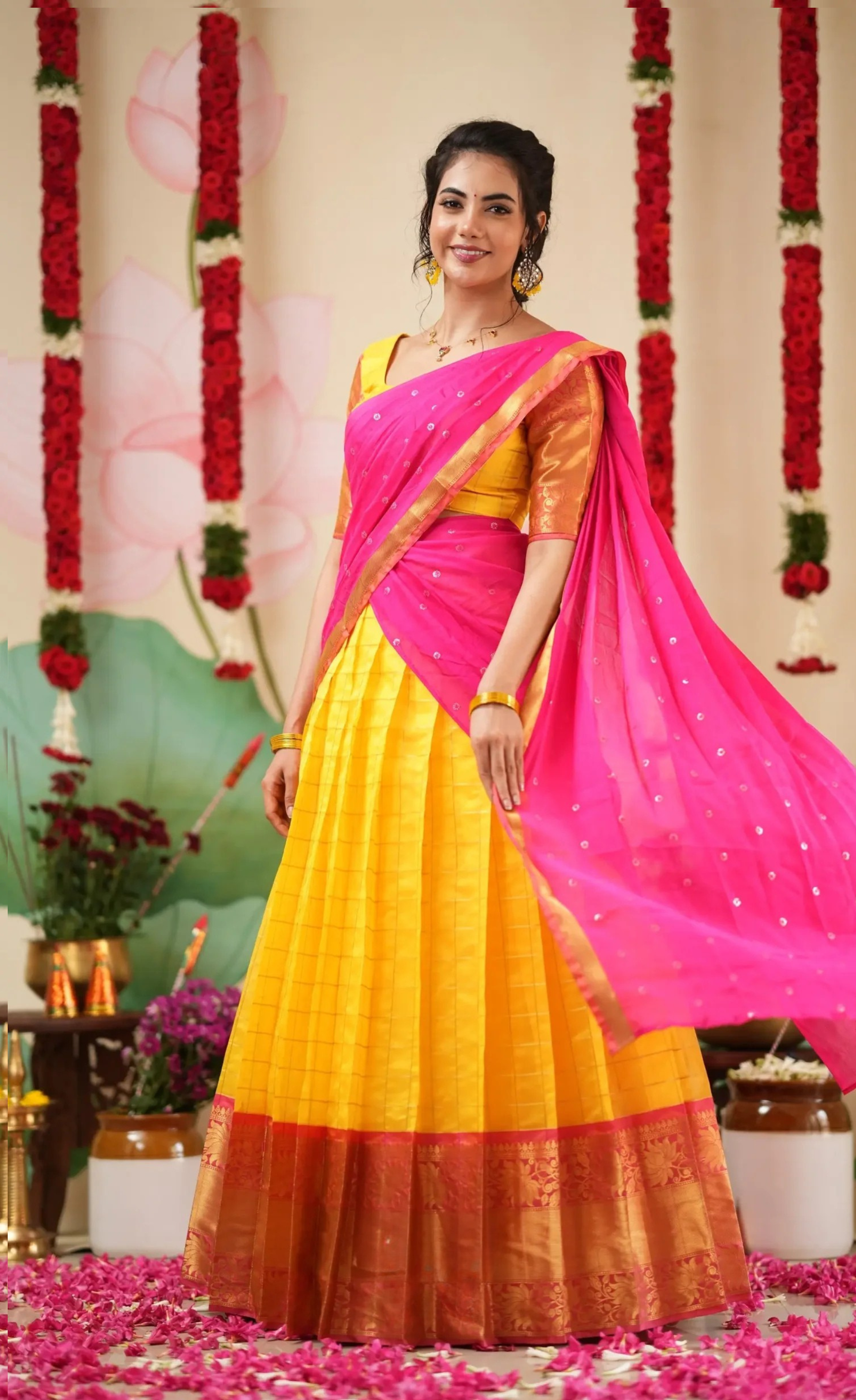 - Design & Craft: Elegant combination of yellow and bright pink tones with a contrasting chinnon dhavani for a refined finish.
