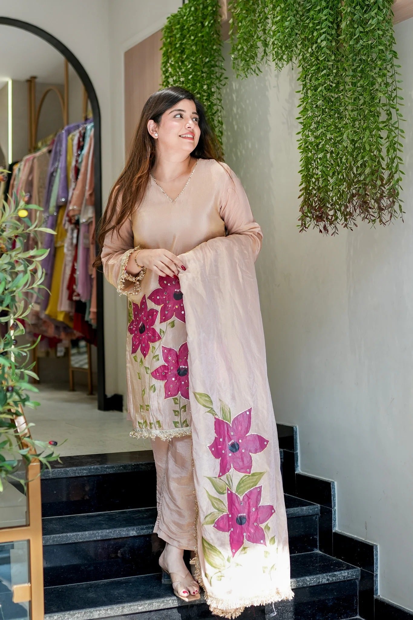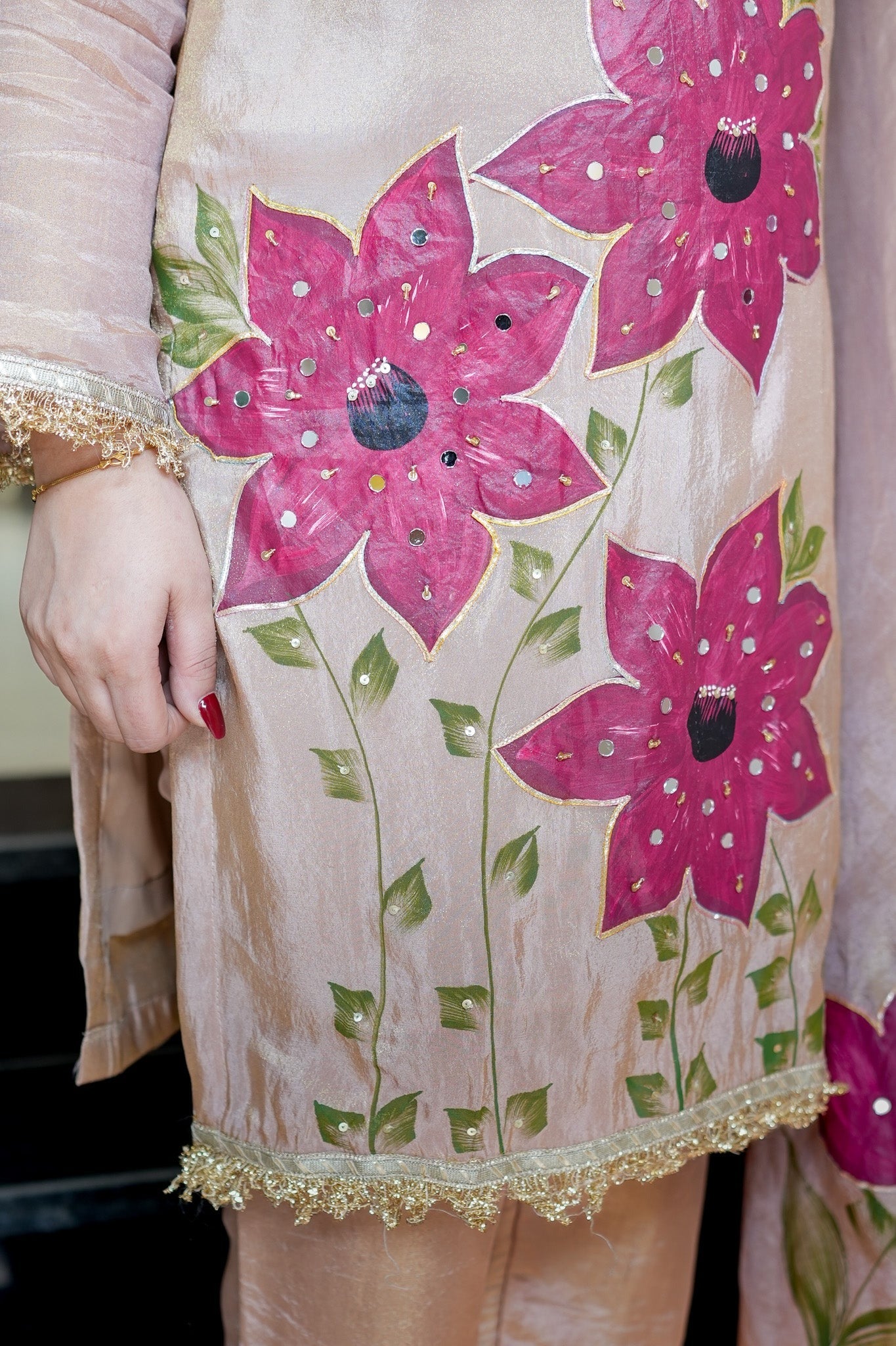 Step into luxury with the Aadhira Hand Painted Suit Set, crafted from exquisite shimmer tissue fabric that catches the light beautifully with every move. This suit combines artistic finesse with modern sophistication, featuring delicate hand-painted motifs that celebrate timeless craftsmanship. The lustrous fabric gives a rich, graceful fall, making it ideal for festive gatherings, wedding functions, or elegant evening occasions.