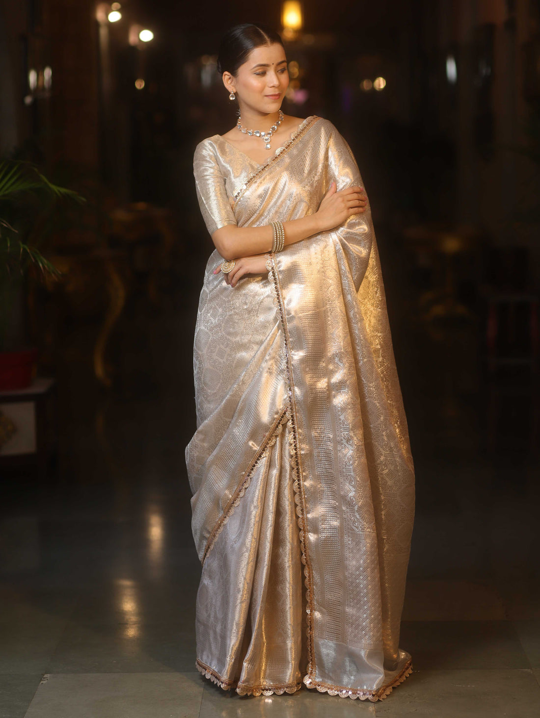 Add the Silver Tissue Saree with Zari Lace to your collection and dazzle at every celebration with timeless elegance and charm.