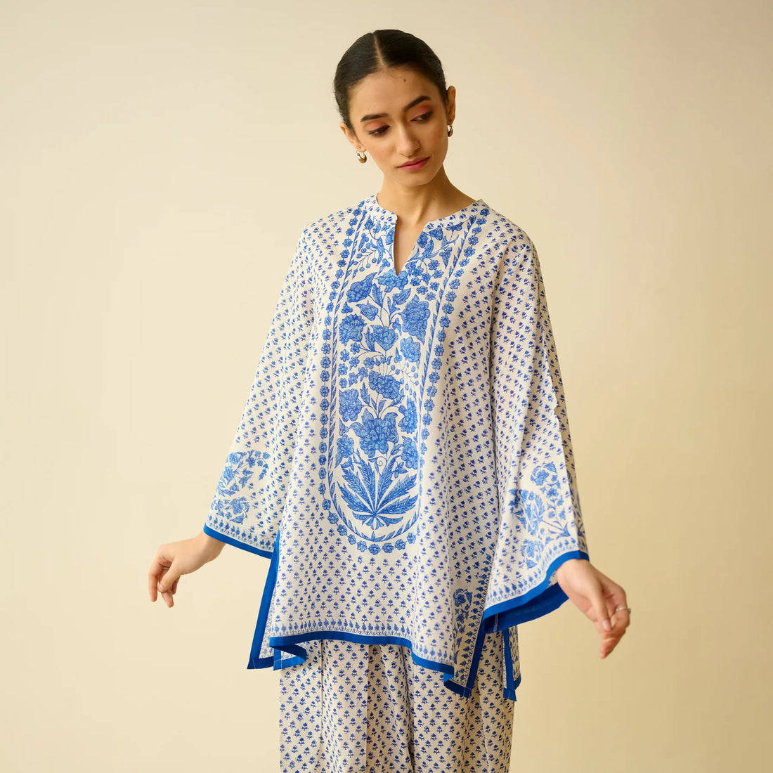 Graceful, breathable, and effortlessly elegant, the Smriti Bagh Farsi Set in Jaipur Blue is designed for women who appreciate comfort blended with timeless ethnic charm. Crafted from soft cotton mulmul, this ensemble offers an airy feel and relaxed silhouette, making it perfect for long days, warm weather, and easy festive dressing.