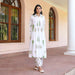 The centerpiece of the set is the block-printed A-line kurta, crafted from soft white cotton. It features a shirt collar with a fixed front placket and imitation buttons that add a crisp, clean look. The three-quarter cuffed sleeves are beautifully decorated with schiffli panel detailing, giving the kurta a refined and modern touch. The relaxed A-line silhouette ensures a flattering fit, allowing you to move freely and comfortably all day long.