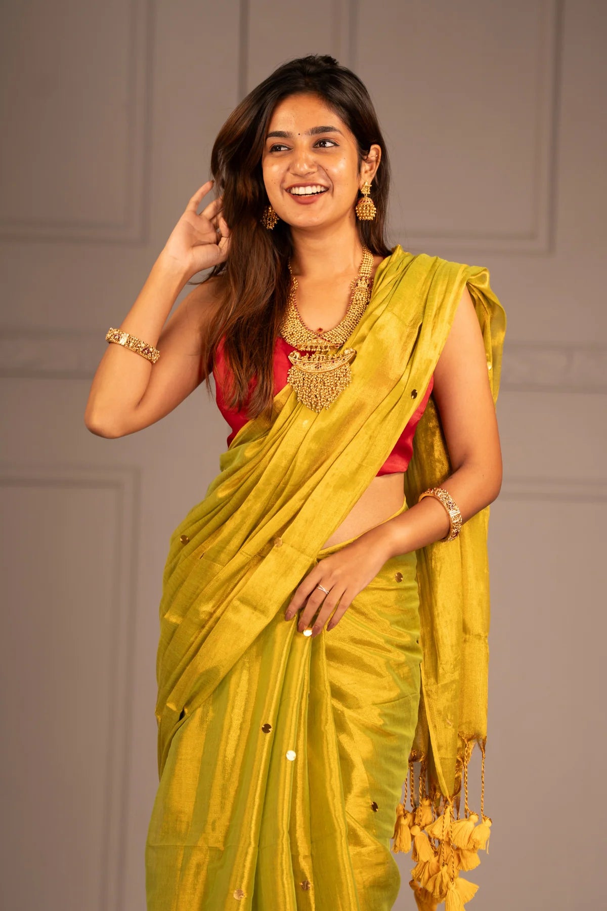 Add this Sunbeam Yellow Tissue Mul Cotton Saree to your wardrobe for lightweight comfort, cheerful elegance, and timeless festive charm.