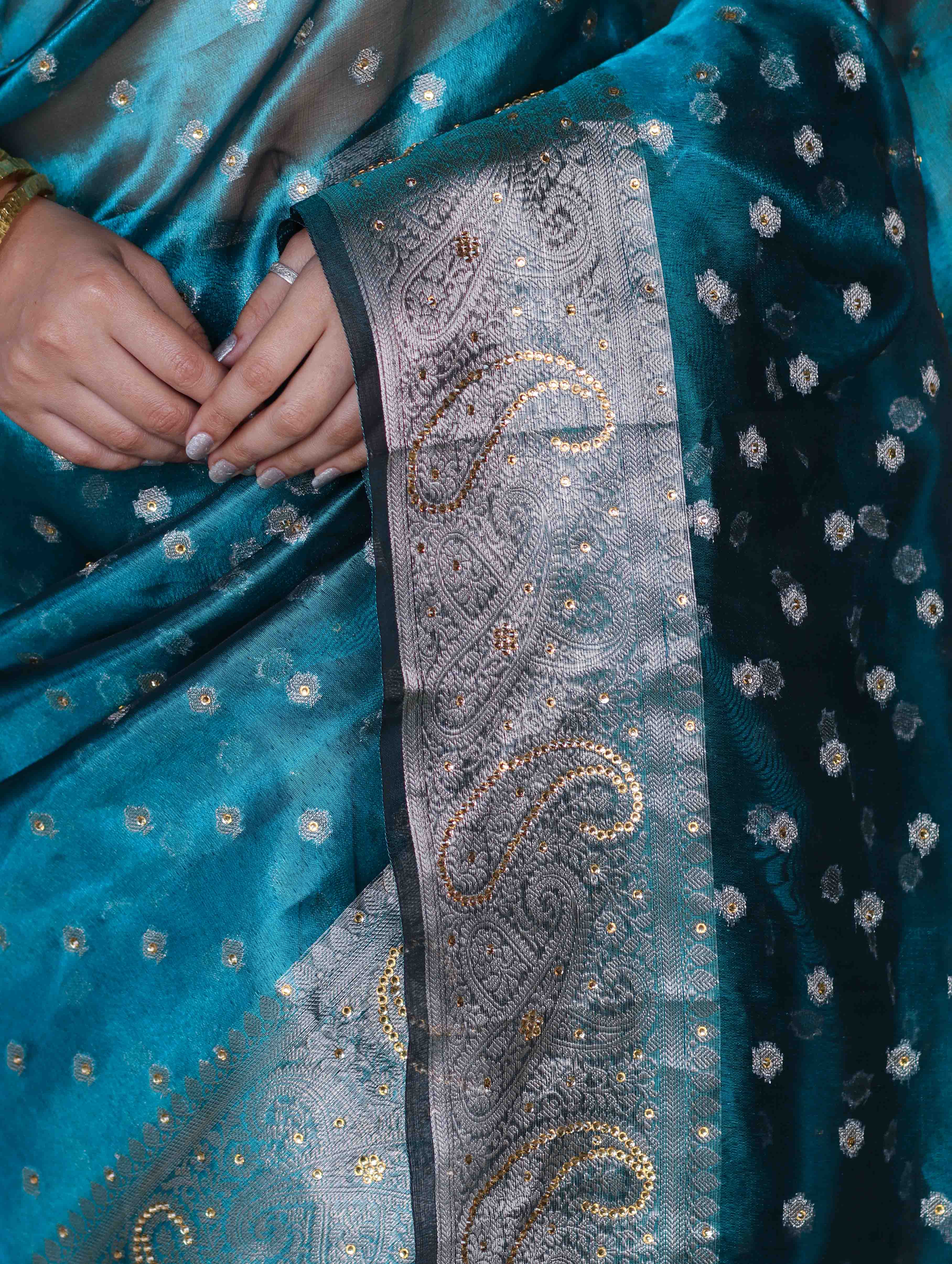 Add the Turquoise Blue Banarasi Tissue Saree with Swarovski to your wardrobe for a sparkling blend of tradition, luxury, and elegance.