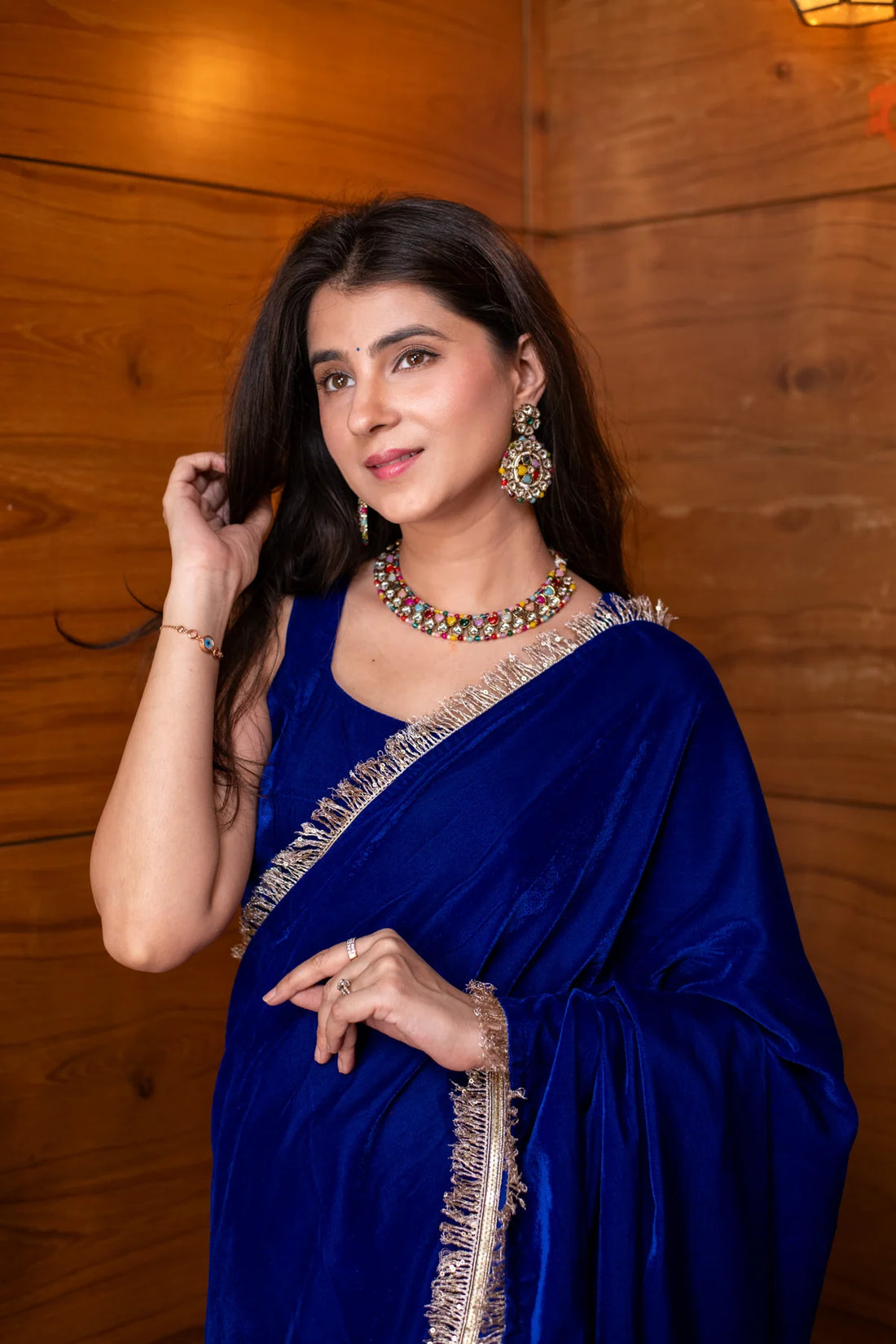 Make an unforgettable entrance in the Velvet Electric Blue Ready-to-Wear Saree, where rich colour meets effortless draping. Designed for modern celebrations, this pre-stitched silhouette gives you the elegance of a traditional saree without the hassle of pleating. The plush velvet texture adds depth and shine, while the fluid fall creates a flattering shape that moves gracefully with you.
