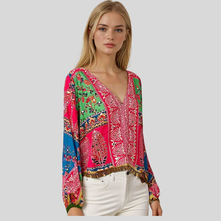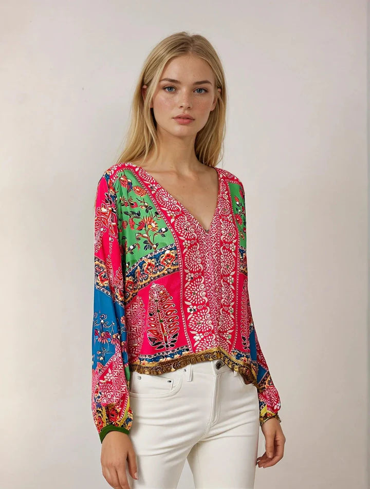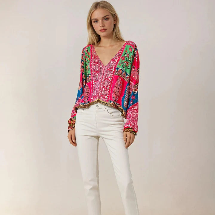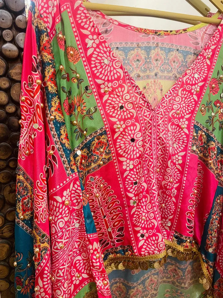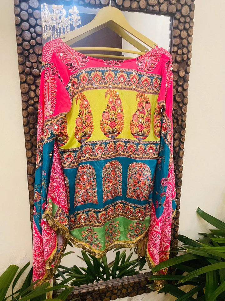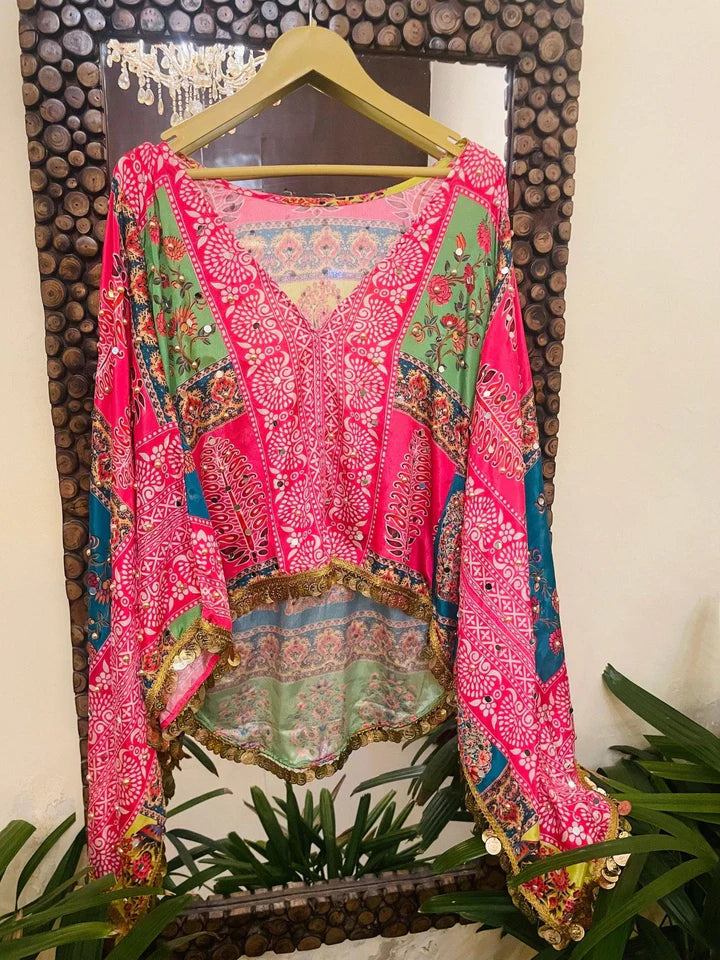 A perfect blend of tradition and modern flair, the Vibrant Pink Gulabi Fusion Top brings color, craftsmanship, and style together effortlessly. Crafted with Bandhani-inspired patterns, its flowy silhouette adds grace and ease to your look. The dramatic flared sleeves, intricate mirror-lace edging, and handcrafted patchwork make it a statement piece for any occasion. Ideal for festive brunches, get-togethers, or special evenings, this top ensures you radiate charm and confidence wherever you go.