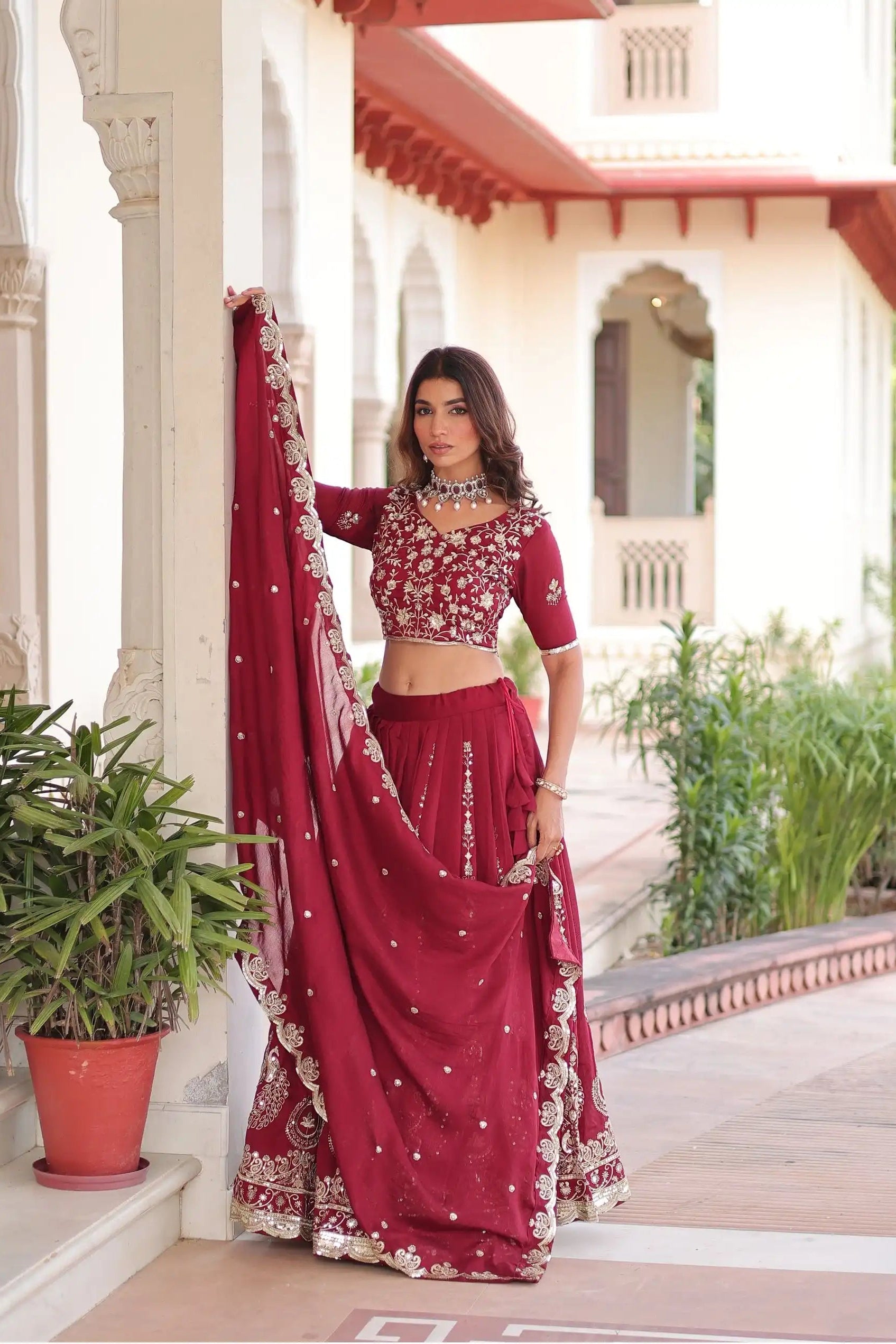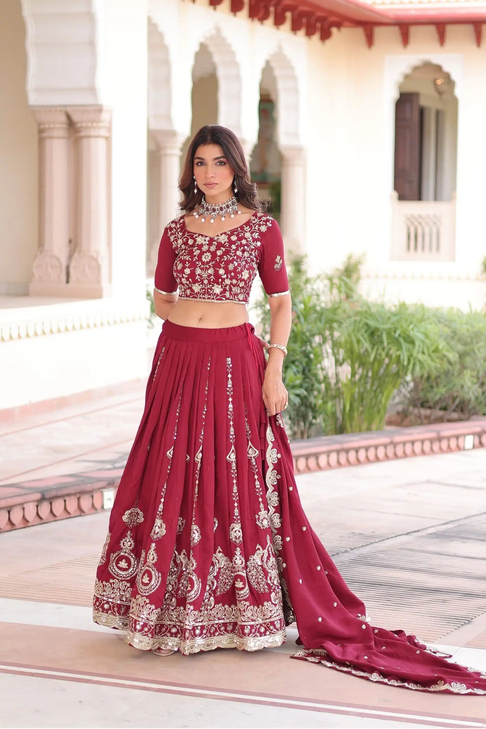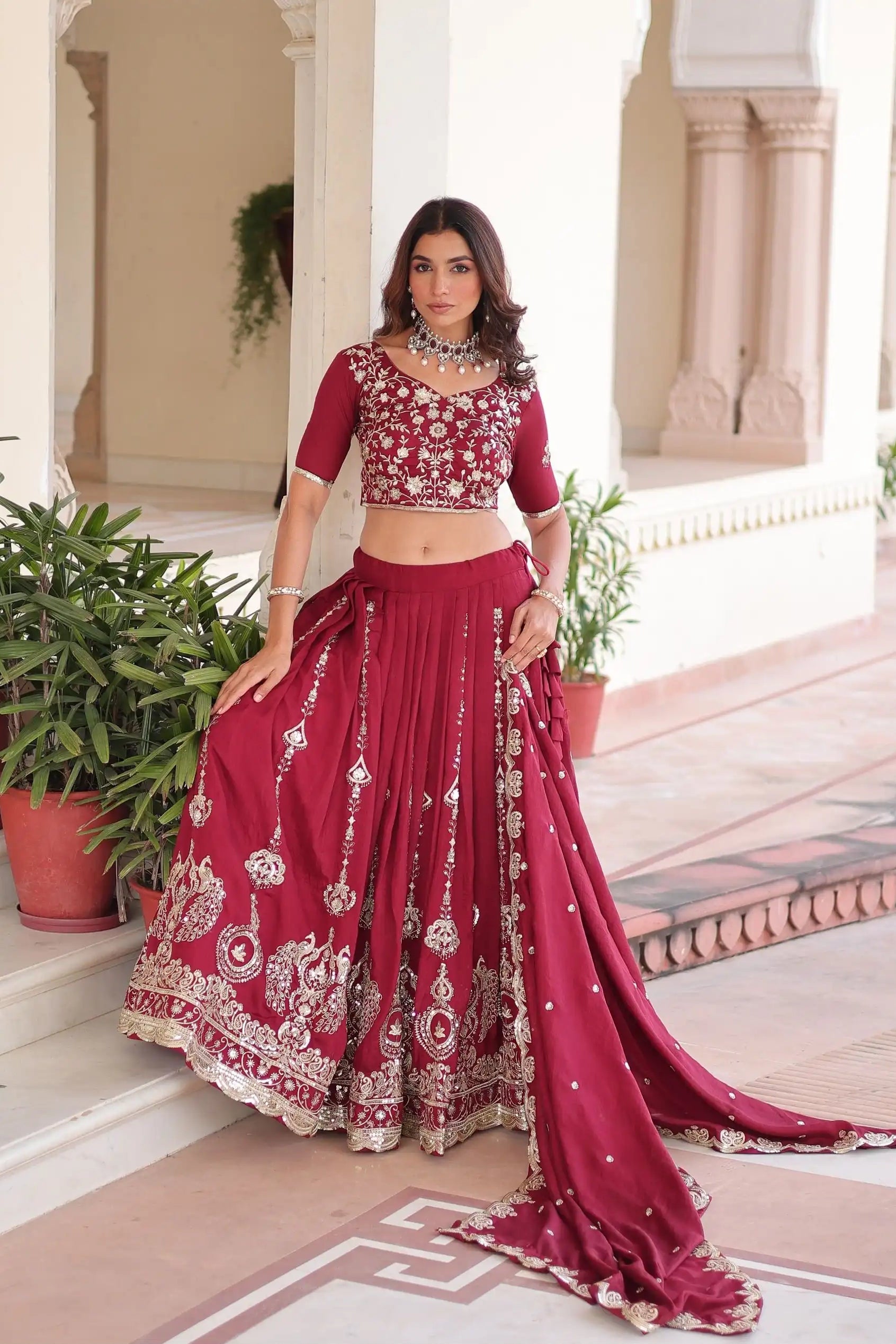 This Vichitra Silk Sequins Embroidered Lehenga Choli brings together lavish detailing, graceful craftsmanship, and a rich festive appeal. The beautifully flared lehenga with heavy sequin and thread embroidery offers a stunning sparkle, while the soft cotton inner ensures comfort throughout long celebrations. Paired with an unstitched blouse for customizable tailoring and a matching embroidered dupatta, this ensemble is perfect for weddings, sangeet nights, and grand festivities.