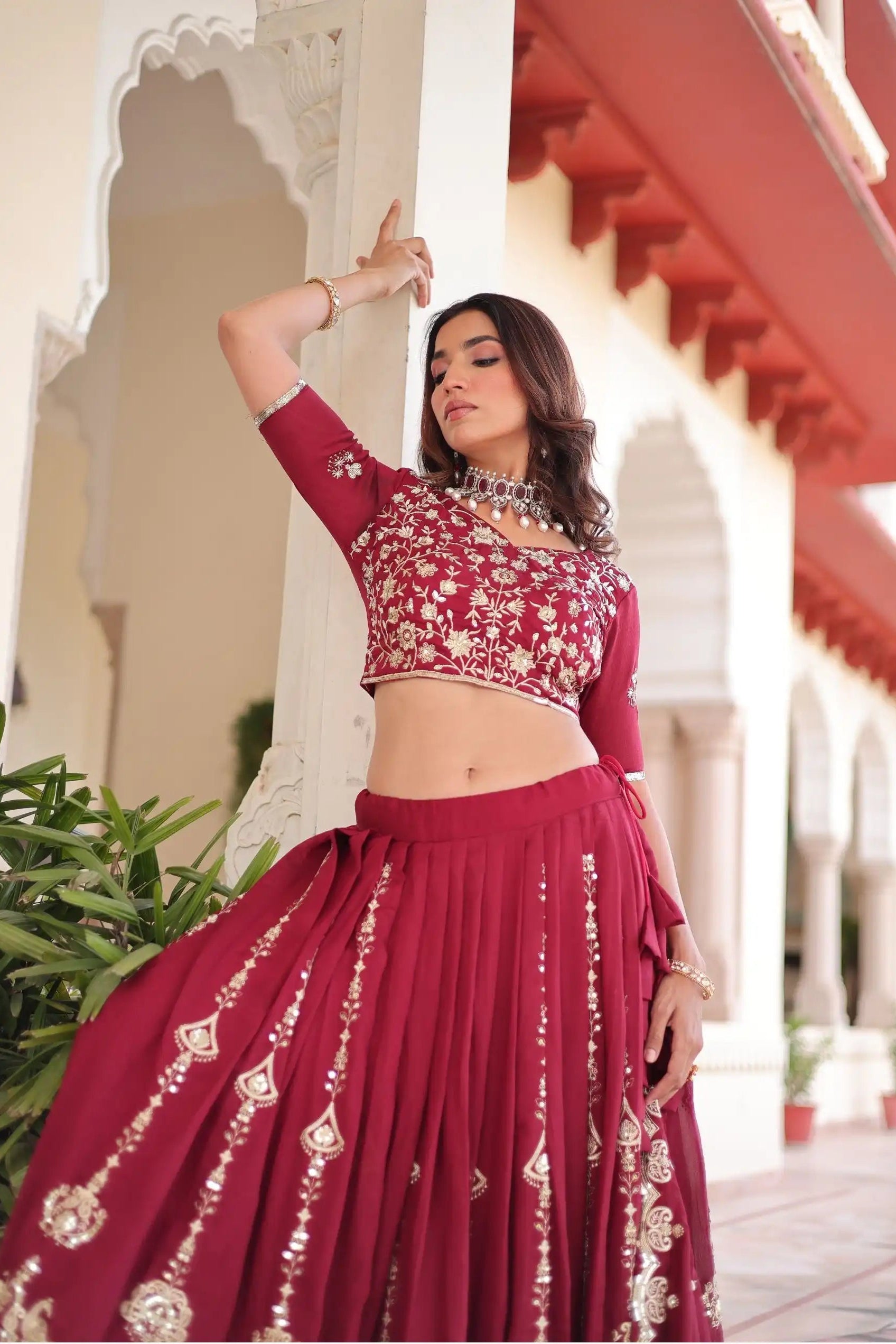 This embroidered Vichitra Silk Lehenga Choli is crafted to make every festive moment memorable with elegance, shimmer, and tradition blended to perfection.