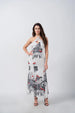 Featuring a halter neckline with a tie-back design, the dress highlights your shoulders and back with elegance. The adjustable tie-back ensures a customized fit, while the clean lines of the dress maintain a polished silhouette. The floral pattern, in shades of white, grey, and a touch of red, creates a balanced and stylish aesthetic.