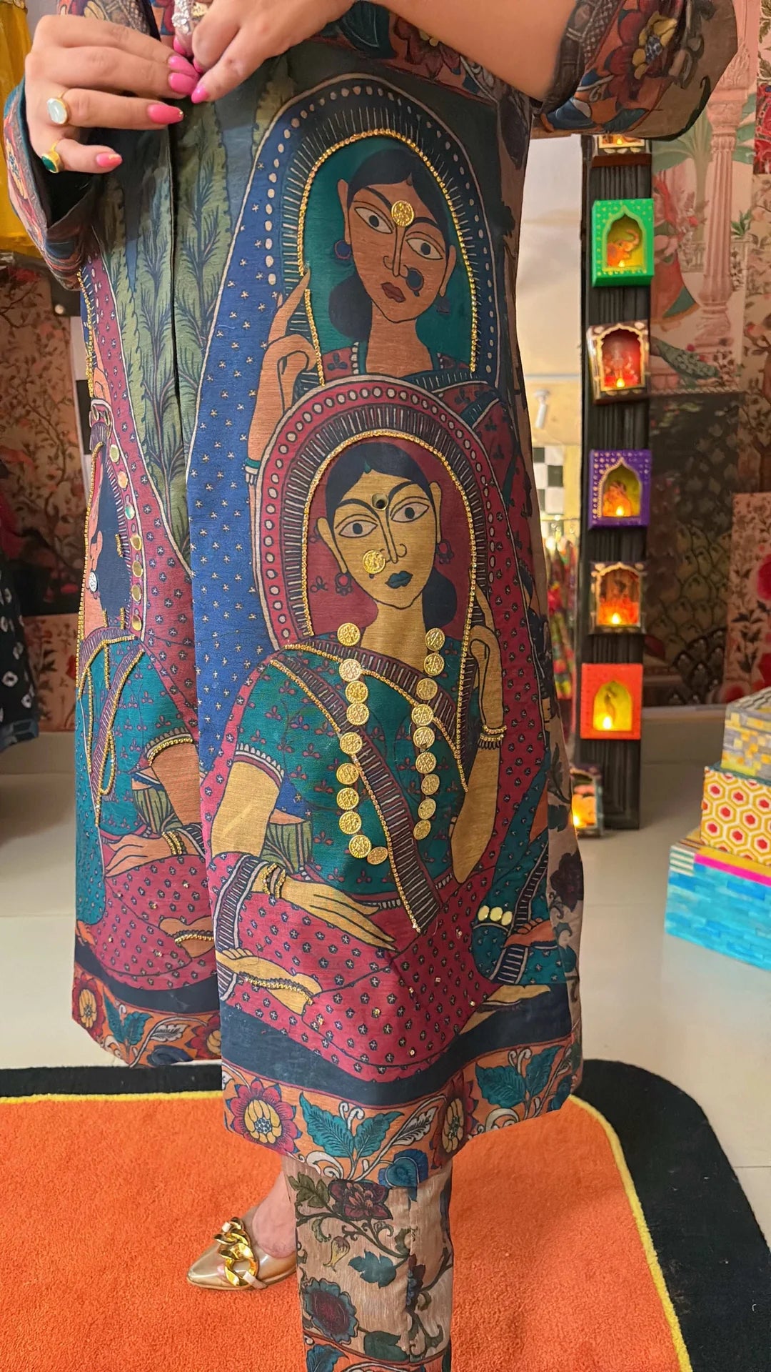✨ Long Jacket: Statement button-down jacket showcasing Kalamkari portraits of regal women, highlighted with intricate golden detailing.