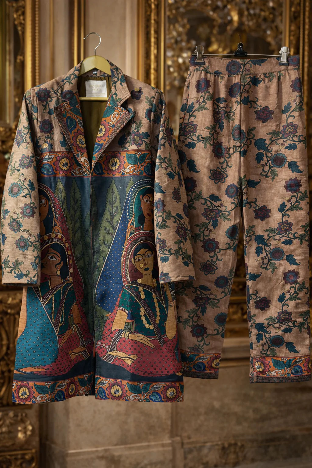 ✨ Trousers: Coordinated straight-fit pants featuring floral Kalamkari motifs, balancing comfort with artisanal charm.