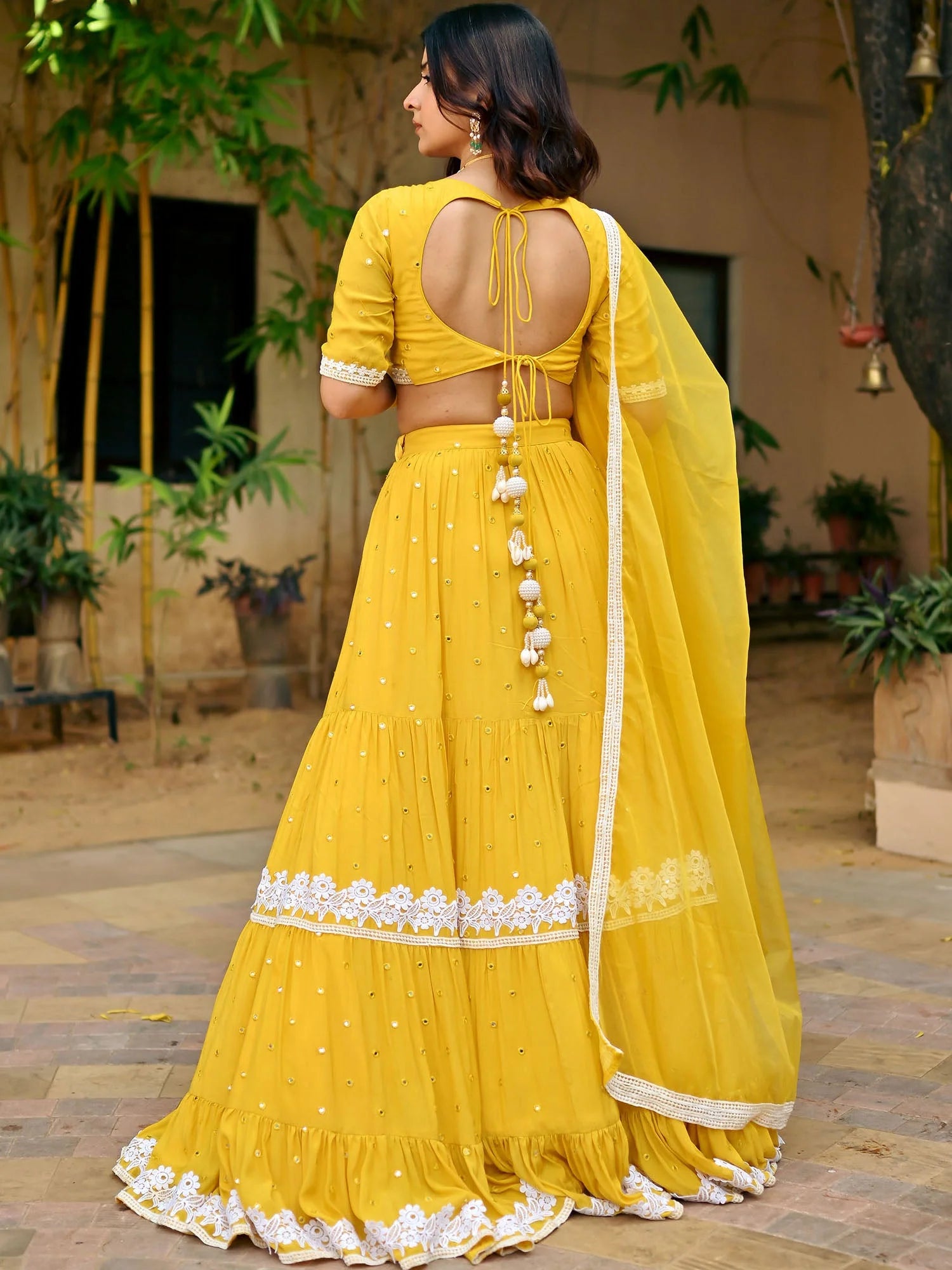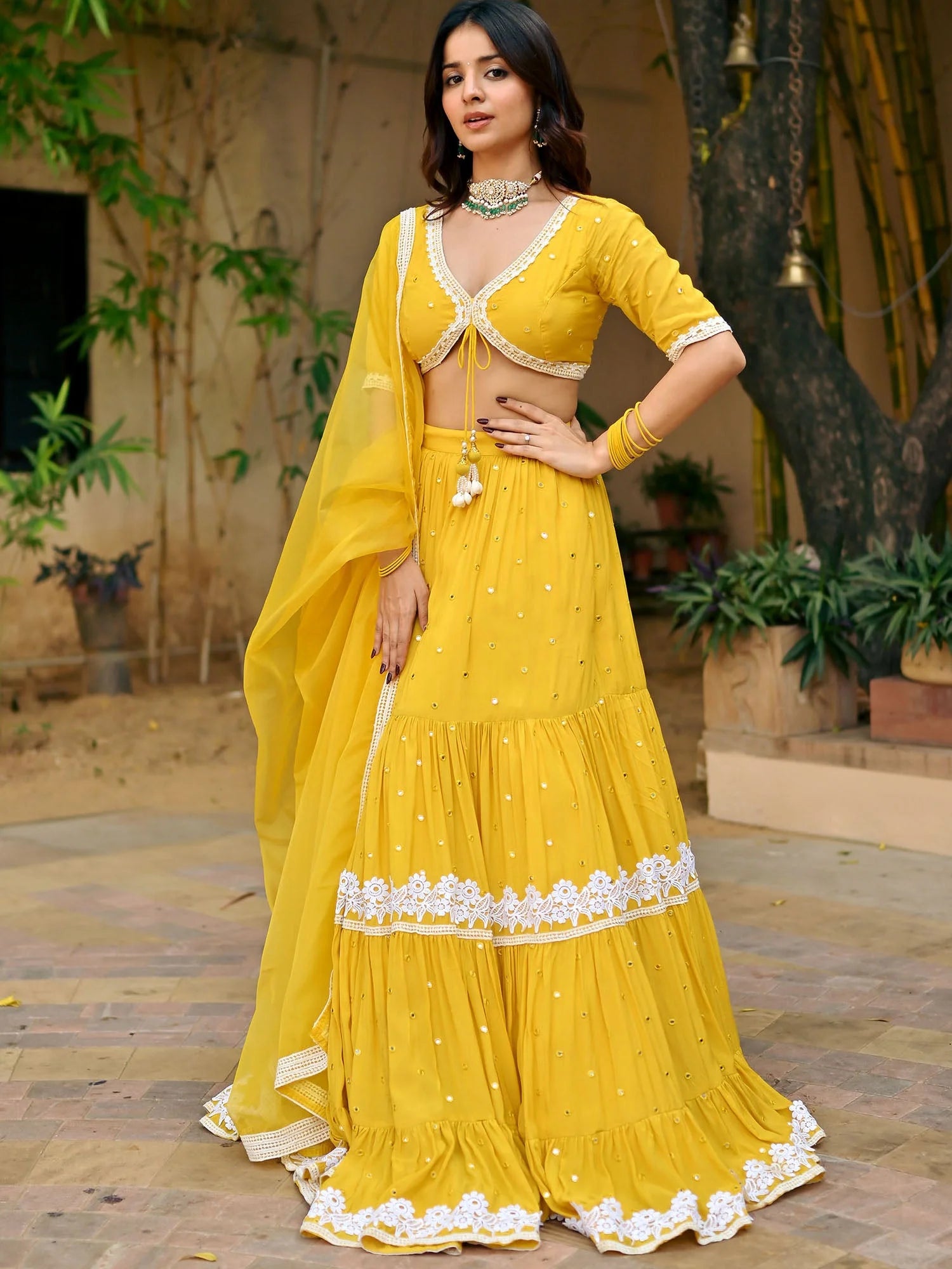 Add this Yellow Organza Mirror Lehenga Set to your collection for vibrant elegance, sparkling detailing, and celebration-ready style.