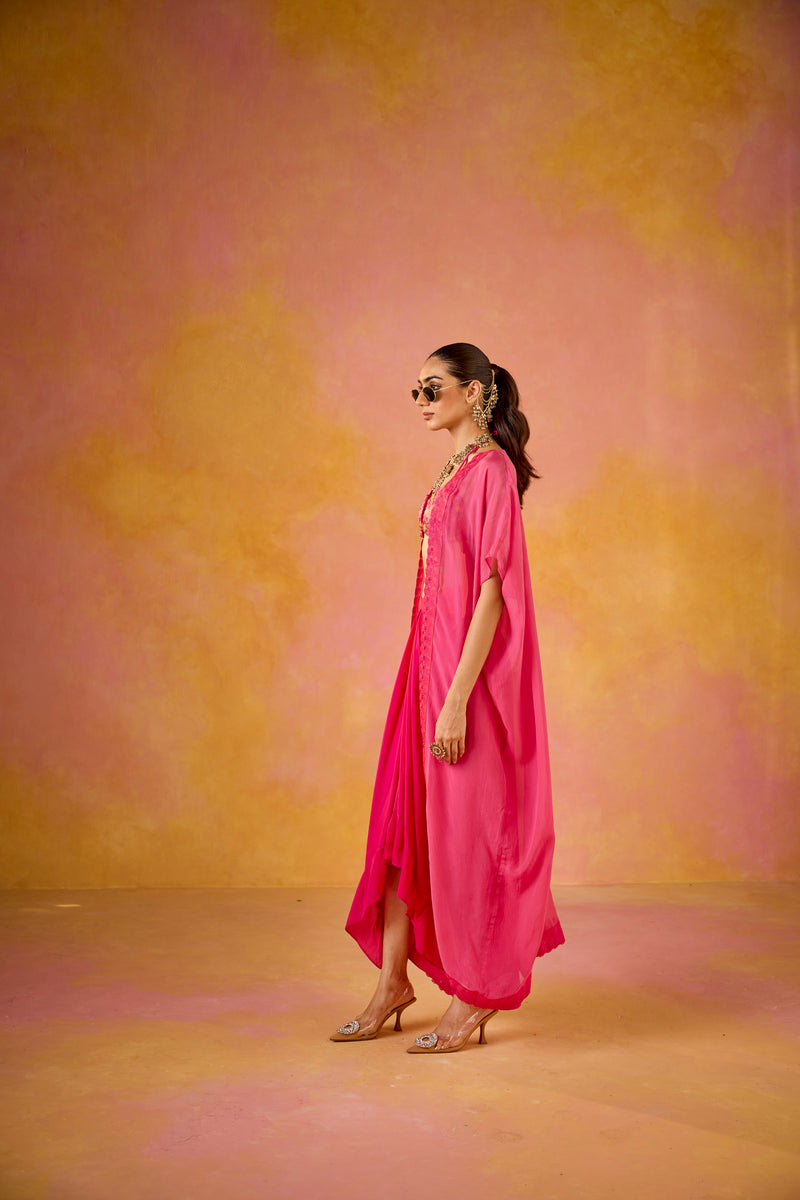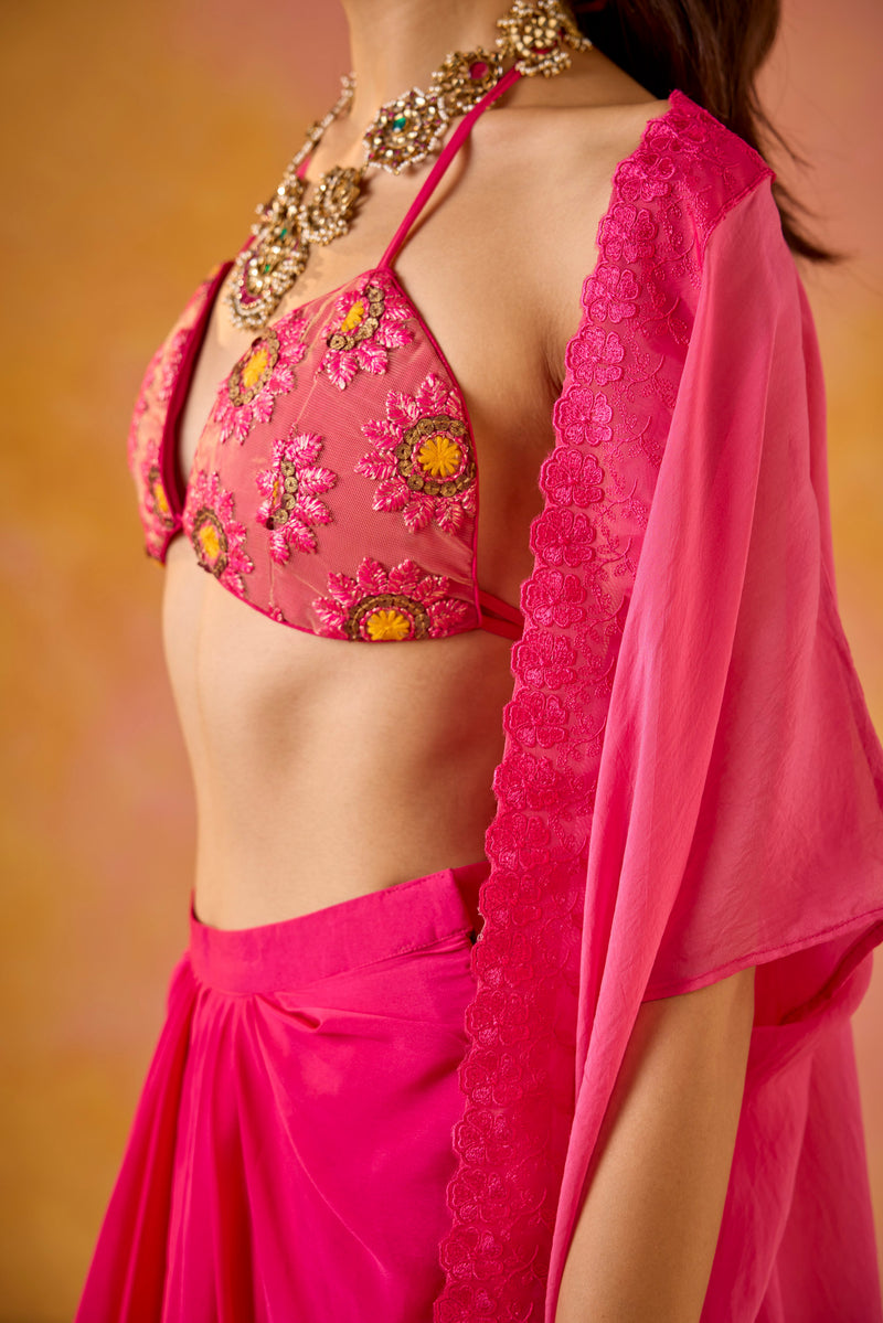 Zeba Hot Pink Embroidered Blouse and Crepe Skirt Set With Cape